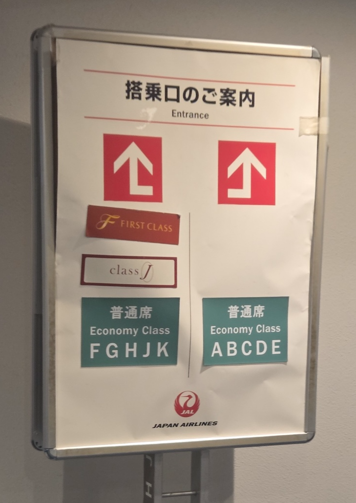 일본항공 JL525 항공편의 보딩 순서 제가 탑승한 JL525편의 경우 출발 시간이 오후 5시 35분이었기에 탑승은 5시 15분부터 진행되었습니다. 보딩 10분 전에 게이트의 직원이 나와서 우선탑승 줄을 설 수 있도록 안내 스크린과 라인을 설치했고 그 라인에 따라 그룹 1과 그룹 2 승객이 각각 2줄씩 줄을 서기 시작했습니다. 저는 원월드 사파이어 등급 혜택으로 그룹 2에 배정되었고요. 탑승 시간인 5시 15분에 탑승이 시작되었고 그룹 1의 줄이 없어지자마자 따라서 그룹 2의 탑승이 시작되었습니다. 탑승은 보딩 패스의 QR코드 또는 바코드를 게이트에 인식시킨 후 들어가는 방식이었습니다. 광동체의 경우 보딩 브리지가 2개 붙게 되는데 일등석과 클래스 J, 이코노미 클래스 중 F, G, H, J, K열 승객은 항공기 왼쪽 첫 번째 도어로 향하는 왼쪽 브리지로, 이코노미 클래스 중 A, B, C, D, E열 승객은 항공기 왼쪽 두 번째 도어로 향하는 오른쪽 브리지로 탑승하게 됩니다.