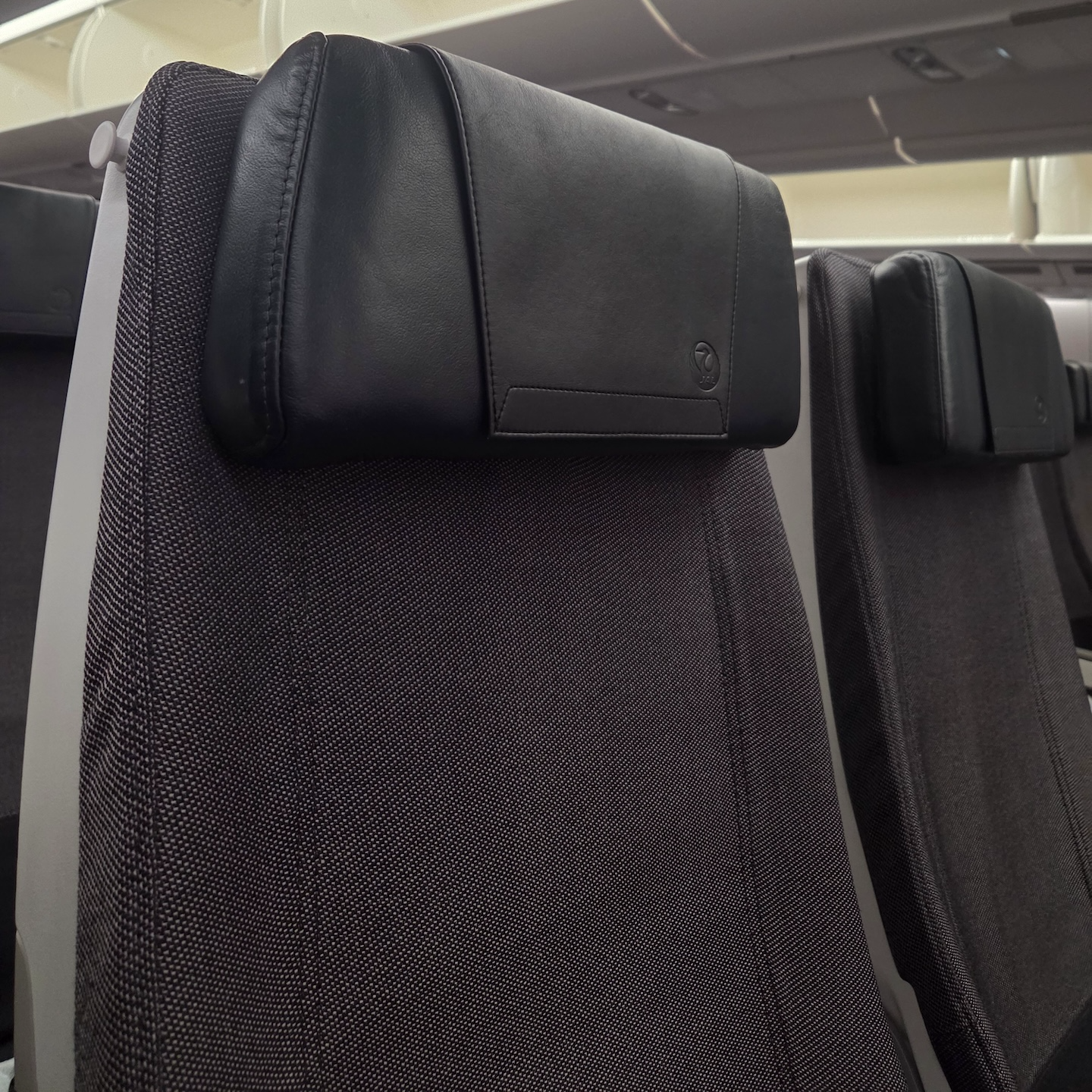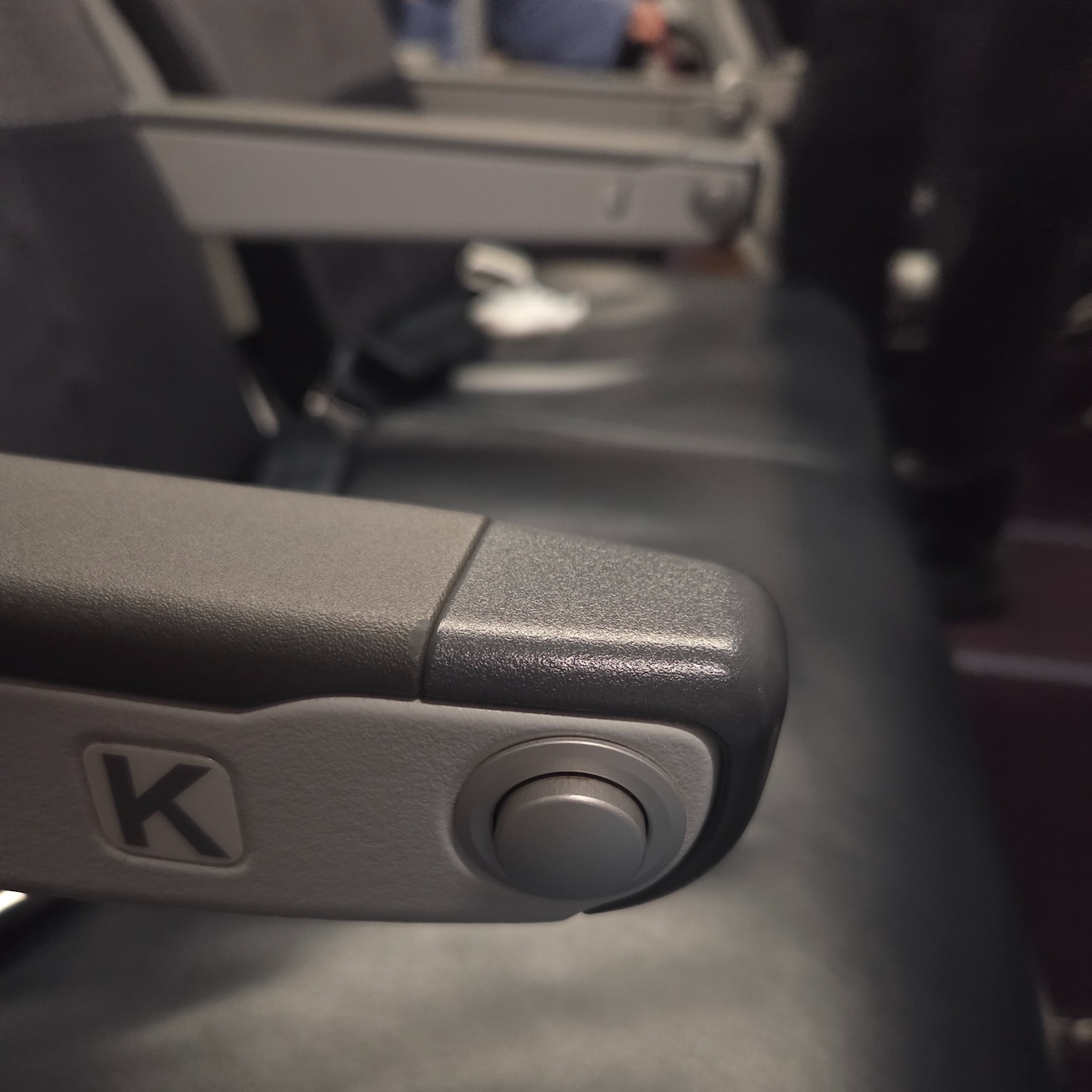 일본항공 A350-900 이코노미 클래스 좌석 제가 이번 비행에서 앉은 좌석은 28K로 클래스 J캐빈 바로 뒷 부분, 벌크헤드 좌석 다음에 위치한 좌석입니다. 전반적으로 붉은 계열이 사용된 A350-900의 퍼스트 클래스, 클래스 J좌석과는 달리 이코노미 클래스 좌석에는 어두운 무채색 계열의 색이 많이 사용되어 좋게 말하면 차분하고, 나쁘게 말하면 조금은 심심할 수 있는 느낌이 듭니다. 일본항공 A350-900의 이코노미 클래스 좌석은 일본항공 A350-1000 이코노미 클래스 좌석과 동일한 레카로 CL3710 좌석이 사용되어서 전반적인 느낌은 비슷합니다. 좌석의 엉덩이 부분은 가죽으로 되어 있어 청소가 용이하게 되어 있지만, 등받이 부분은 천으로 되어서 공기가 잘 통하는 형태였고요, 가죽으로 된 헤드레스트는 6-way로 조정이 가능해 1~3시간 내외의 국내선에서 충분히 편하게 이동할 수 있게 도와주었습니다.