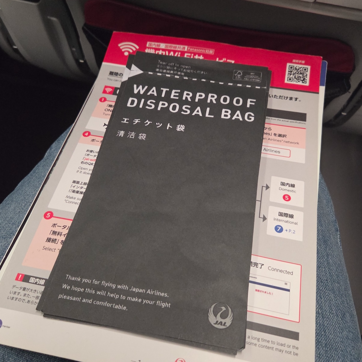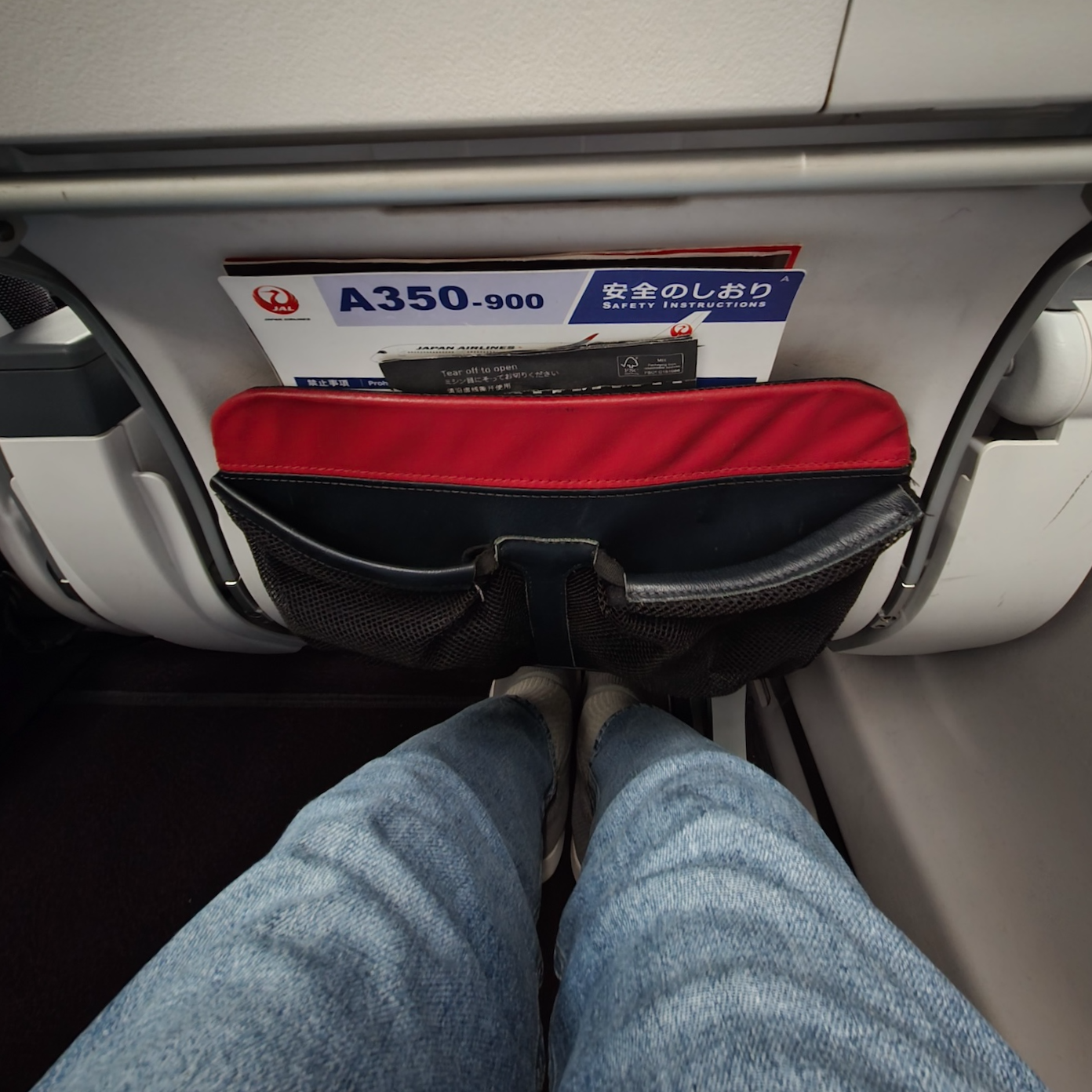 일본항공 A350-900 이코노미 클래스 수납 주머니와 안전 책자 레카로의 CL3710좌석은 무릎이 닿는 위치의 공간을 최대한으로 확보하고 그 윗부분에 책자 수납함이나 테이블을 배치한 형태로 레그룸이 꽤 잘 뽑힌 좌석입니다. 180cm 성인이 엉덩이를 좌석 끝에 딱 붙이고 앉으면 주먹 하나가 여유롭게 들어갈 정도의 레그룸을 제공합니다. 다리를 쭉 펴도 앞 좌석에 걸리는 것 없이 충분히 다리를 펴고 쉴 수 있을 정도입니다. 레그룸 부분에는 두 가지의 각기 다른 사이즈의 수납 주머니가 있습니다. 큰 주머니에는 세이프티 카드와 위생봉투가 들어있고, 작은 주머니는 핸드폰이나 물병을 넣기에 적당한 사이즈였습니다.