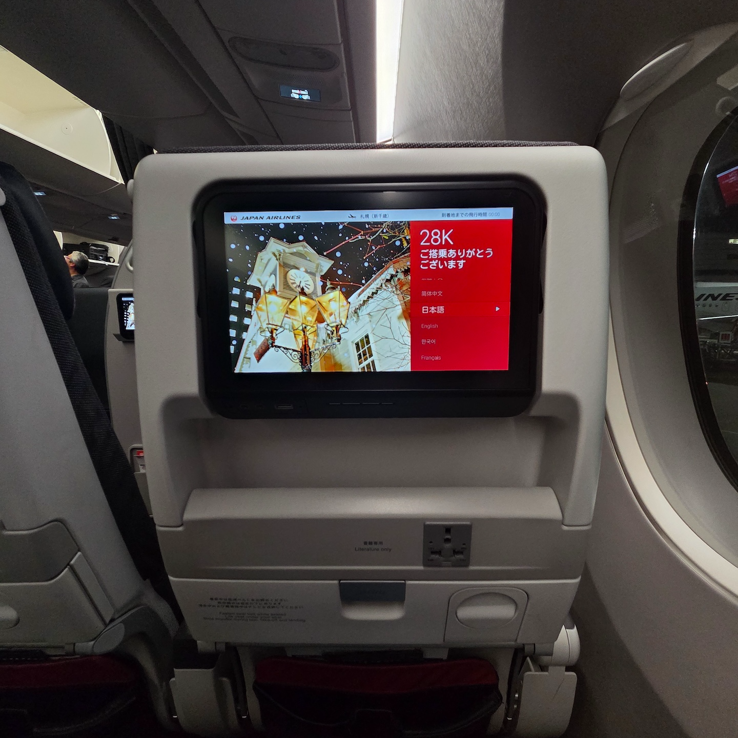 일본항공 A350-900 이코노미 클래스 USB-A 충전단자와 오디오 단자, 디스플레이 틸팅 그 위로는 기내 엔터테인먼트 스크린이 장착되어 있었습니다. HD화질의 10.6인치 넓이의 기내 스크린이 장착되어 있고요, 국제선용 A350-1000보다 사이즈도 작고 화질도 떨어지지만, 사용하기에 불편함이 없고 반사방지 코팅이 되어 있어 더 편리한 점도 있는 그런 스크린이었습니다. 스크린 하단에는 이어폰 단자와 USB-A 포트가 있었습니다. 전원 플러그와 USB-A 충전 포트 모두 비행 중뿐만 아니라 지상 택싱 중이거나 탑승 중에도 사용할 수 있어서 편리했습니다.