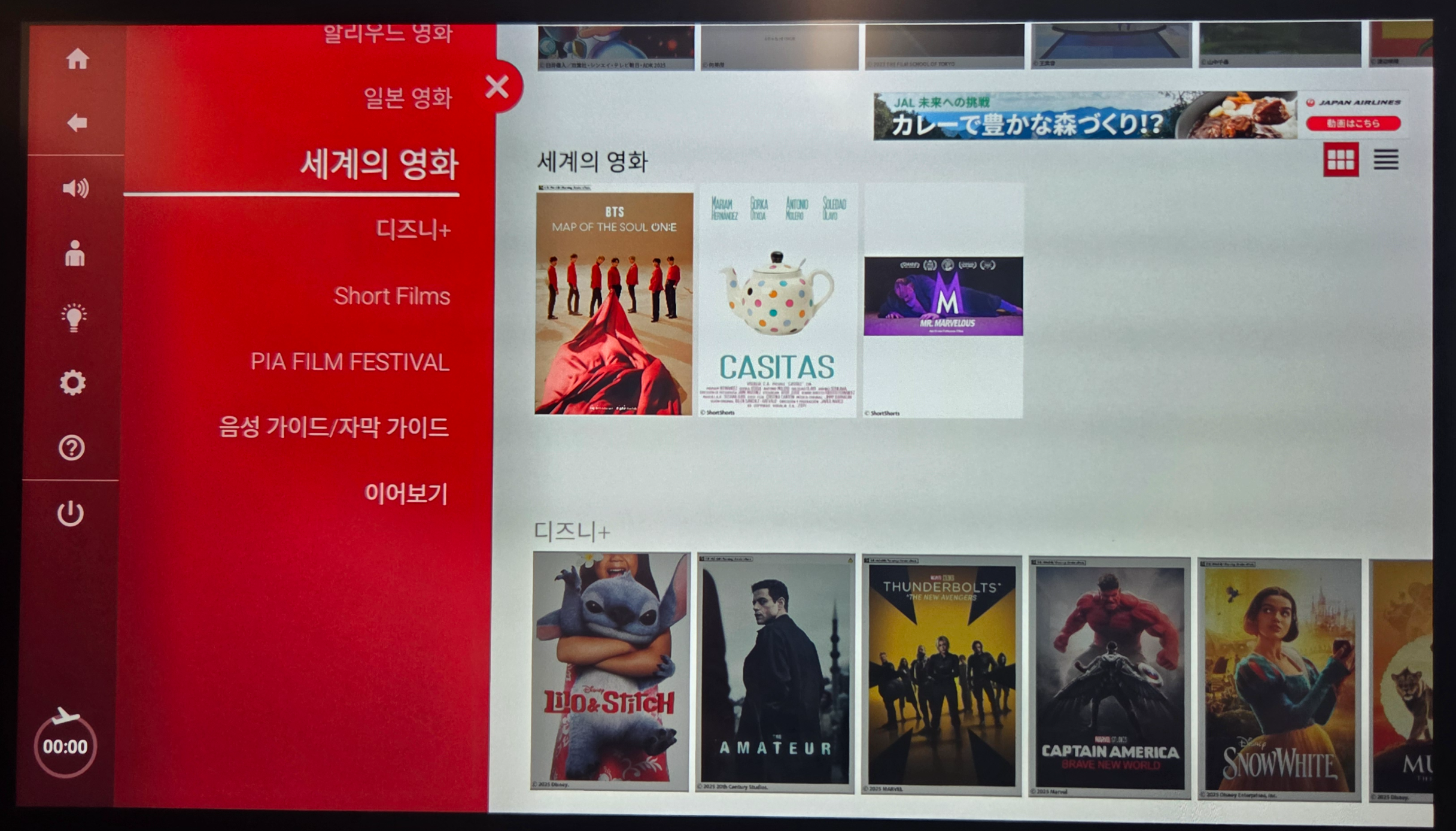 일본항공 A350-900 기내 엔터테인먼트 시스템 비행지도와 항공기 외부 카메라 일본항공 국내선 전용 A350-900항공기에는 10인치의 기내 엔터테인먼트 스크린이 탑재되어 있습니다. 다만, 국제선 기내 엔터테인먼트와 비교해 보면 컨텐츠가 더 적고 일본 현지 사람들에게 특화되어 있는 모양이었습니다. 컨텐츠 양 자체는 많지는 않았지만 그래도 영어, 한글 등 외국어 지원도 되고, 비행지도와 항공기 외부 카메라도 지원하는 기내 엔터테인먼트 시스템이라 일본 현지인이 아니더라도 단거리 비행에서 충분히 괜찮은 기내 엔터테인먼트 시스템이었습니다. 참고로 이코노미 클래스에서도 기내 엔터테인먼트용 이어폰을 무료로 제공합니다.