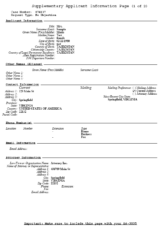 Supplementary Applicant Information Pages: 다운로드 받은 패킷에서 DS-3035 다음에 위치한 페이지입니다. 하단에 Important: Make sure to include this page with your DS-3035라고 써있습니다. 페이지 6~7에 위치해 있습니다.