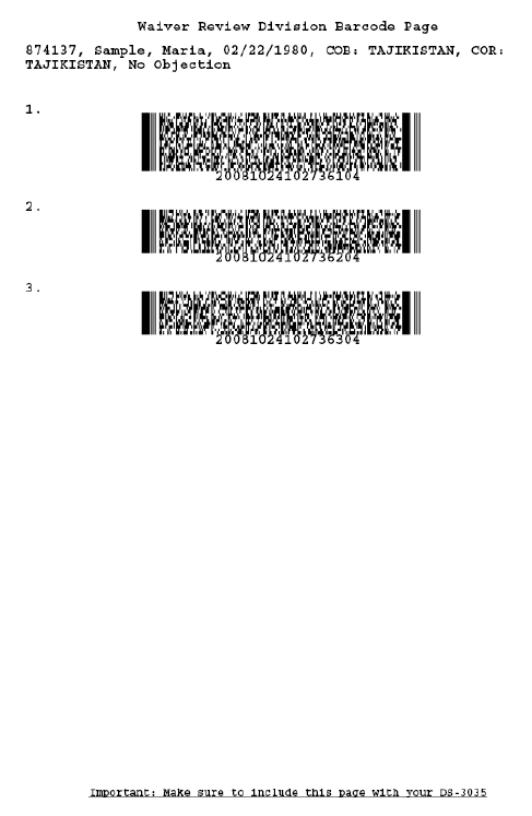 Waiver Review Division Barcode Page: 바코드가 상단에 3개 있는 페이지로 온라인 신청서를 완료한 후 다운로드 받은 패킷의 두번째 페이지에 있습니다. (패킷에서의 위치는 달라질 수 있습니다)