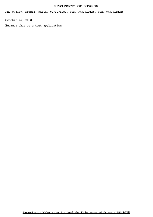 Statement of Reason: 온라인 신청서를 작성할 때 작성한 내용으로 다운로드 받은 패킷에서 찾을 수 있습니다. 제 경우는 페이지 8에 위치해 있었습니다.