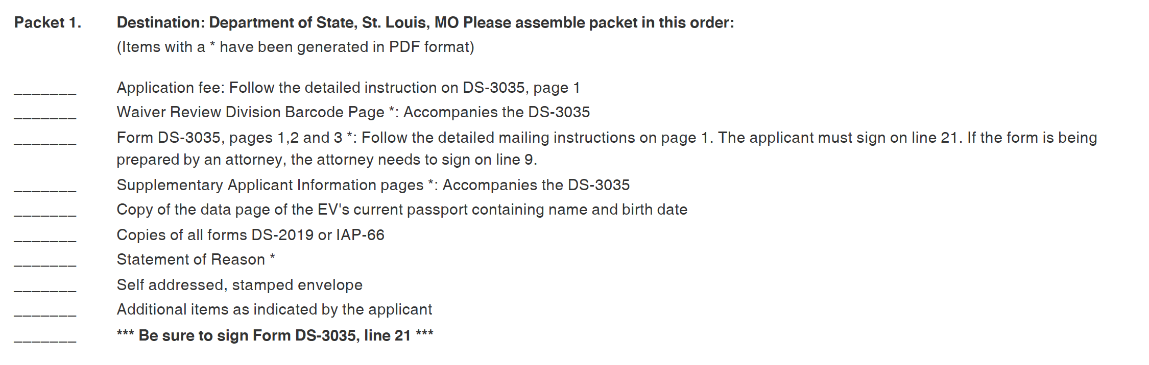 DS-3035 패킷의 첫 페이지에서는 신청인이 국무부로 DS-3035를 발송할 때 어떠한 서류들을 함께 발송해야 하는지 확인할 수 있는 리스트를 제공하고 있습니다. Packet1이 국무부로 보내야 하는 서류고, Packet2가 영사관을 통해 대사관으로 보내져야 하는 서류입니다.