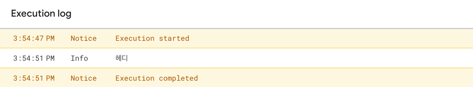 function promptExample1() { var ui = SpreadsheetApp.getUi(); Logger.log(ui.prompt('이름이 무엇입니까?').getResponseText()); }위의 스크립트를 실행시킨 후 input 필드에 이름을 입력하고 Ok 버튼을 누른 후 실행 로그를 확인하면 아래와 같은 로그를 확인할 수 있습니다.