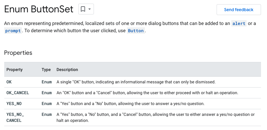 구글 앱스 스크립트 레퍼런스 Enum ButtonSet (c) google.com 아까 언급된 ButtonSet 타입의 매개변수 button에 대한 이야기를 해보겠습니다. 이 ButtonSet은 Base Service 에 포함된 Enum타입에 속하는 객체입니다. 이 Enum 타입은 자바 스크립트에서는 기본적으로 제공되는 자료형은 아닙니다. (물론 자바 스크립트에서 이와 비슷한 기능을 구현해 사용할 수 있습니다.) 따라서 구글 앱스 스크립트에서 사용되는 자료형이라고 생각하시면 됩니다. 이 구글 앱스 스크립트에서 Enum 타입의 자료형은 구글에서 미리 정의한 어떤 것들의 묶음입니다.(구글 앱스 스크립트 레퍼런스에서는 이 Enum 타입을 열거형이라는 유형으로 번역하고 있습니다.) 미리 어떤 버튼들이 들어가는지 세트로 묶여있어 그 세트로만 불러올 수 있는 ButtonSet처럼 말입니다.