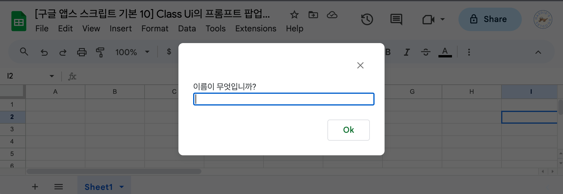 function promptExample2 () { var ui = SpreadsheetApp.getUi(); var response = ui.prompt('이름이 무엇입니까?',ui.ButtonSet.OK_CANCEL).getResponseText(); var ss = SpreadsheetApp.getActiveSpreadsheet(); var sheet = ss.getActiveSheet(); var range = sheet.getRange(1,1); range.setValue(response); }이 스크립트를 실행해보면 지금과 달리 구글 시트에 접근할 권한을 요청하는 팝업을 볼 수 있습니다. (새로 구글 시트 파일을 만들었을 때만 나타나고, 이미 권한이 있는 구글 시트 파일과 구글 스크립트 파일을 활용했으면 이 팝업은 뜨지 않습니다.) 이를 통해 prompt 팝업을 이용해 구글 앱스 스크립트로 값을 가져오는 것은 구글 시트 파일을 수정하는 것이 아니라는 사실을 알 수 있습니다. 권한을 부여한 후 input 필드에 이름을 넣으면 그 값이 A1 셀에 잘 입력되었다는 것을 확인할 수 있습니다.