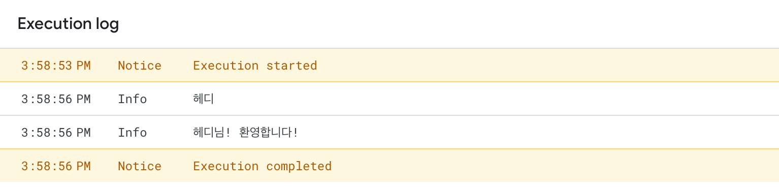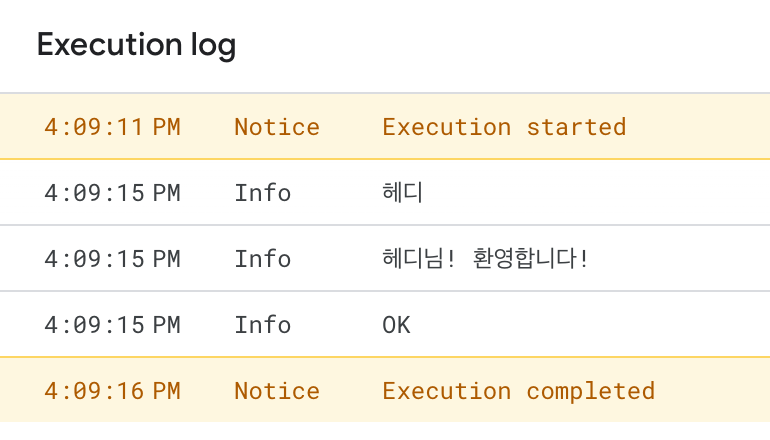 function promptExample1() { var ui = SpreadsheetApp.getUi(); var response = ui.prompt('이름이 무엇입니까?').getResponseText(); Logger.log(response); Logger.log(response+"님! 환영합니다!") }위의 스크립트를 실행해보면 첫 로그는 사용자가 입력한 값을 그대로 보여주게 되고, 두 번째 로그는 그 값에 환영하는 말이 더해진 값을 보여주게 됩니다.