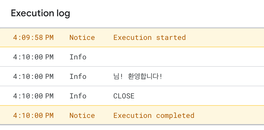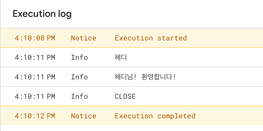 function promptExample1() { var ui = SpreadsheetApp.getUi(); var response = ui.prompt('이름이 무엇입니까?'); var responseText = response.getResponseText(); var responseButton = response.getSelectedButton(); Logger.log(responseText); Logger.log(responseText+"님! 환영합니다!"); Logger.log(responseButton); }먼저 사용자에게 두 번의 prompt 팝업을 띄우는 대신, 변수 response에는 응답을 PromptResponse형태로 가져온 후, 각각 다른 두 개의 변수를 만들어 responseText에는 사용자가 input 필드에 넣은 값을 가져오고 responseButton에는 사용자가 누른 버튼의 값을 가져왔습니다. 이 스크립트를 실행해보면 아래와 같은 결과가 나옵니다.