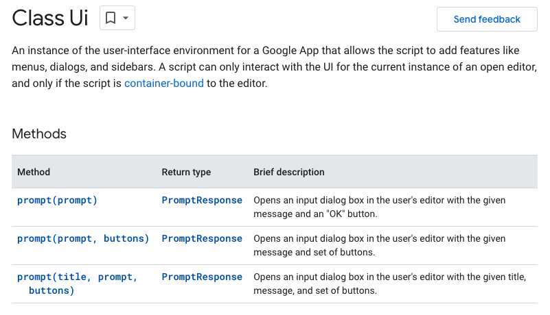 구글 앱스 스크립트 레퍼런스 클래스 Ui (c) google.com prompt 메서드는 들어가는 매개변수의 갯수에 따라 총 3가지의 비슷하면서도 약간은 다른 메서드가 존재합니다. 모든 prompt 메서드의 반환값은 PromptResponse로, 이 반환값은 클래스 PromptResponse의 메서드를 통해 사용자가 입력한 값이나 클릭한 버튼의 값을 받아올 수 있습니다. 다른 말로 하면, prompt 메서드의 반환값을 바로 변수로 사용한다면 사용자가 입력한 값이 아닌 PromptResponse라는 타입을 보게 됩니다.