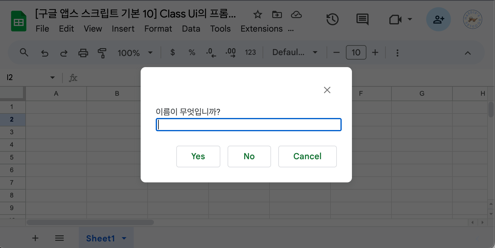 [구글 앱스 스크립트 기본 10] Class Ui의 프롬프트 팝업을 이용해 스크립트와 커뮤니케이션 하기 글의 순서