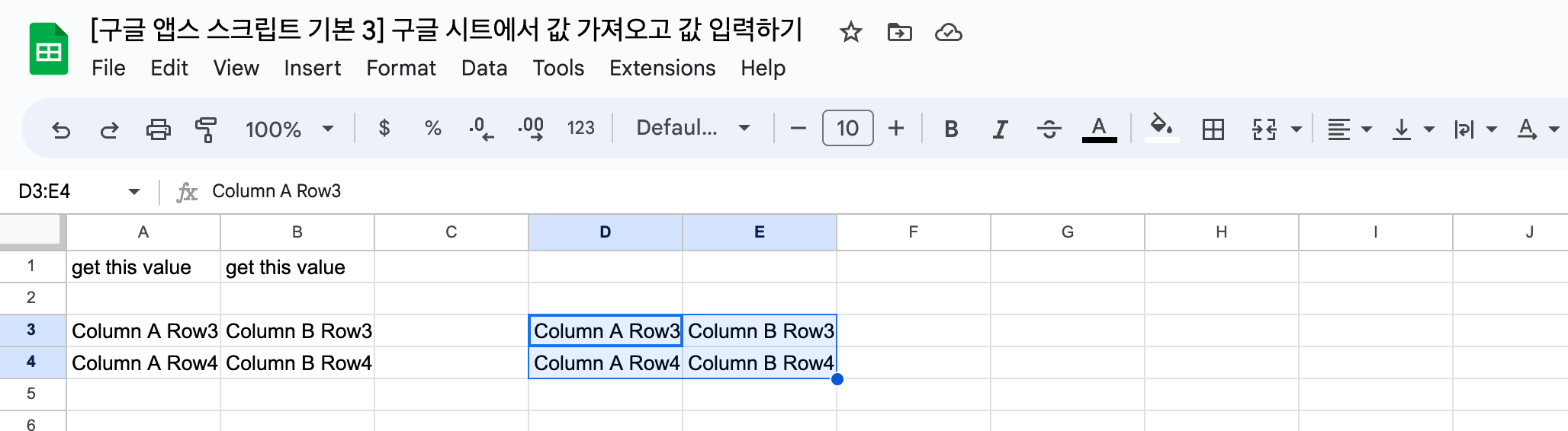 D3:E4 셀에 값이 잘 입력된 모습 '공부 > 구글 앱스 스크립트' 카테고리의 다른 글