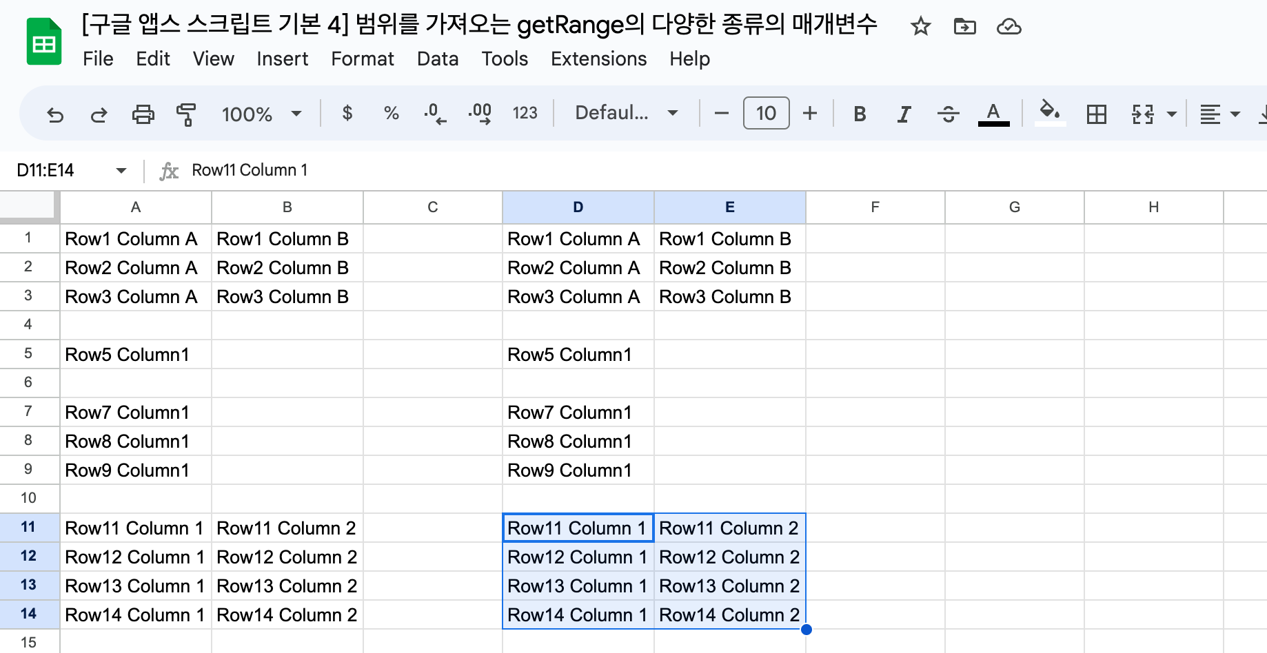 마지막 타입의 매개변수는 바로 위에서 살펴본 row, column, numRows 타입의 매개변수에 numColumns 매개변수가 더해진 형태입니다. numRows가 선택할 행의 개수였던 것처럼, numColumns는 선택할 열의 개수를 뜻합니다. a1 Notation타입의 매개변수를 제외하고 행과 열의 개수가 각각 2개 이상인 범위를 지정할 때 유일하게 사용할 수 있는 타입이 바로 이 row, column, numRows, numColumns 타입입니다. 만약 A1:B3 범위를 이 타입의 매개변수를 활용해 지정하려면 (1,1,2,3)으로, D2:E5 범위의 경우에는 (2,4,4,2)로 지정할 수 있습니다. row, column, numRows, numColumns 타입의 매개변수를 활용해 A11:B14범위에 있는 정보를 D11:E14범위에 넣어보는 예제를 살펴보겠습니다.