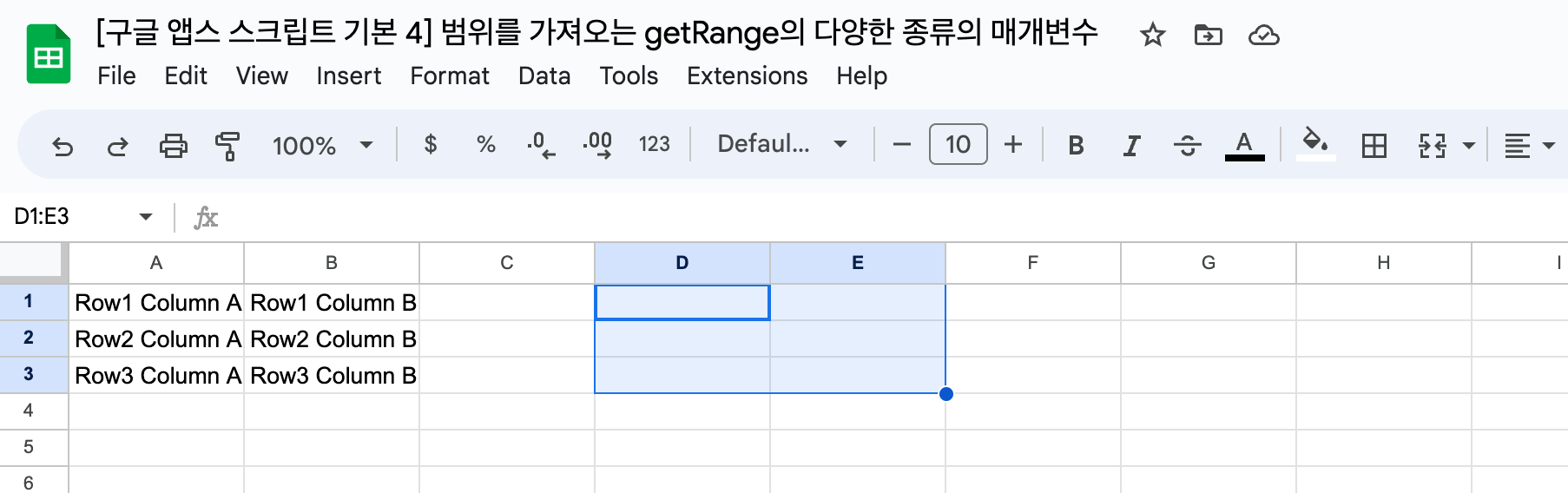 example1이라는 이름을 가지는, a1 Notation을 매개변수로 받는 getRange 메서드를 활용한 코드입니다. getRange의 매개변수로 각각 a1Notation 타입인 "A1:B3", "D1:E3"가 들어가 있는 것을 볼 수 있습니다. 해당 코드를 실행시키면 구글 시트 파일에는 아래 스크린샷과 같은 결과가 나옵니다.