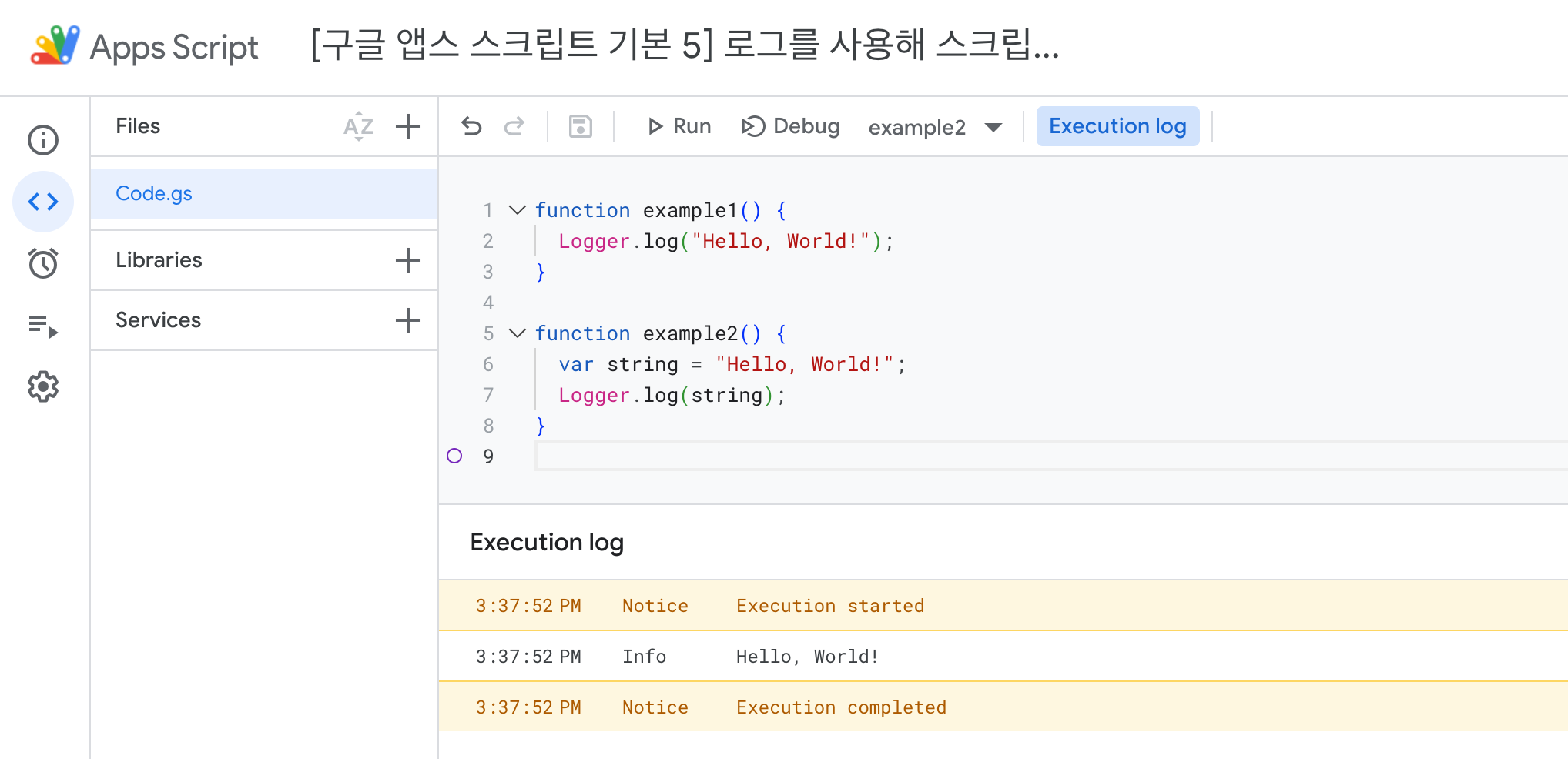 위의 example1 함수를 실행시켜보면 지금까지는 스크립트가 실행되고 종료되었다는 알림만 나오던 실행 로그 창에 "Hello, World!"라는 문자열이 출력된 것을 알 수 있습니다. 이처럼 문자열을 로그 기록으로 남기고 싶다면, log 메서드의 파라미터로 문자열을 뜻하는 따옴표와 함께 원하는 문자열을 넣으면 됩니다. 저와 같이 새로운 구글 시트 파일과 이 파일에 결합된 구글 앱스 스크립트 파일을 만드셔서 위의 스크립트를 작성하셨다면, 지금까지와는 다르게 권한이 없으니 권한을 달라는 팝업이 뜨지 않는다는 것을 볼 수 있습니다. 이는 지금까지 Spreadsheet Service를 통해 구글 앱 스크립트에서 구글 시트 파일로 접근하는 것과는 달리, Base Service는 구글 앱 스크립트 내에서 자체적으로 실행되는 코드이기 때문에 따로 권한이 필요하지 않기 때문입니다. 만약 변수를 넣고 싶으면 어떻게 해야 할까요. 다음 예제는 변수를 로그로 출력시키는 예제입니다.
