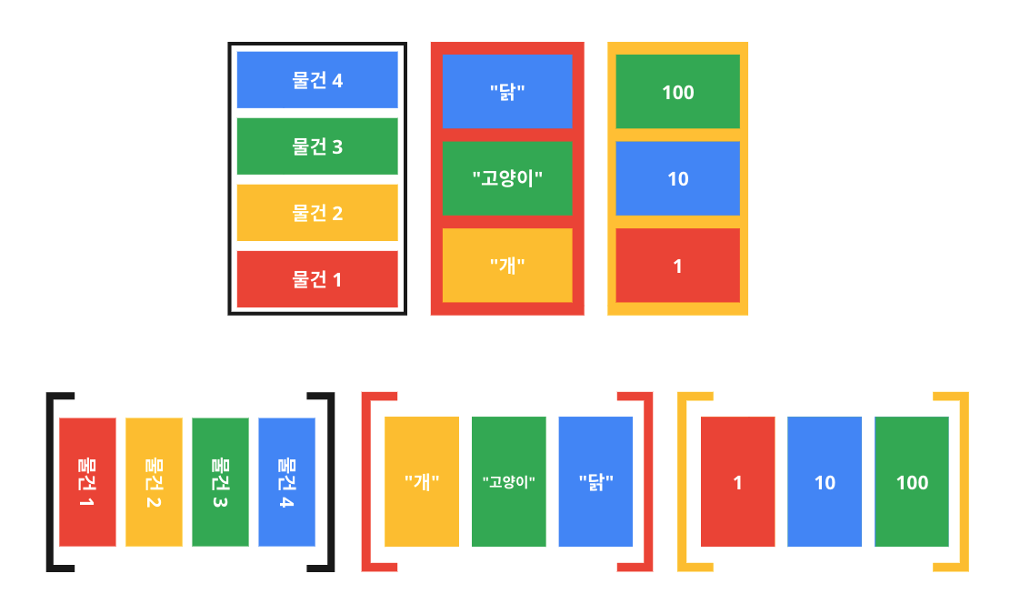 박스에 물건을 넣을 때는 한 단에 하나의 물건을 넣는 방식을 활용해 여러단으로 넣을 수 있습니다. 이 경우 각 단은 물건을 넣은 순서에 따라 번호가 붙여지게 되고, 번호가 붙여진 각각의 단에는 하나의 물건만 존재할 겁니다. 이런 형태를 배열에 그대로 적용시켜 보겠습니다. 대괄호 []라는 박스 안에 한 단에 하나의 물건(Element/요소)을 넣는다면 이런 형태를 띠게 됩니다. [물건 1, 물건 2, 물건 3, 물건 4,...] 이러한 형태를 띠는 배열이 1차원 배열입니다. 만약 문자열인 요소 개, 고양이, 닭이 순서대로 들어간 1차원 배열을 만든다면 그 배열은 ["개", "고양이", "닭"]과 같은 형태를 띠게 됩니다. 만약 숫자 형태의 요소 1, 10, 100을 순서대로 넣은 1차원 배열을 만든다면 그 배열은 [1, 10, 100]과 같은 형태를 띠게 됩니다.