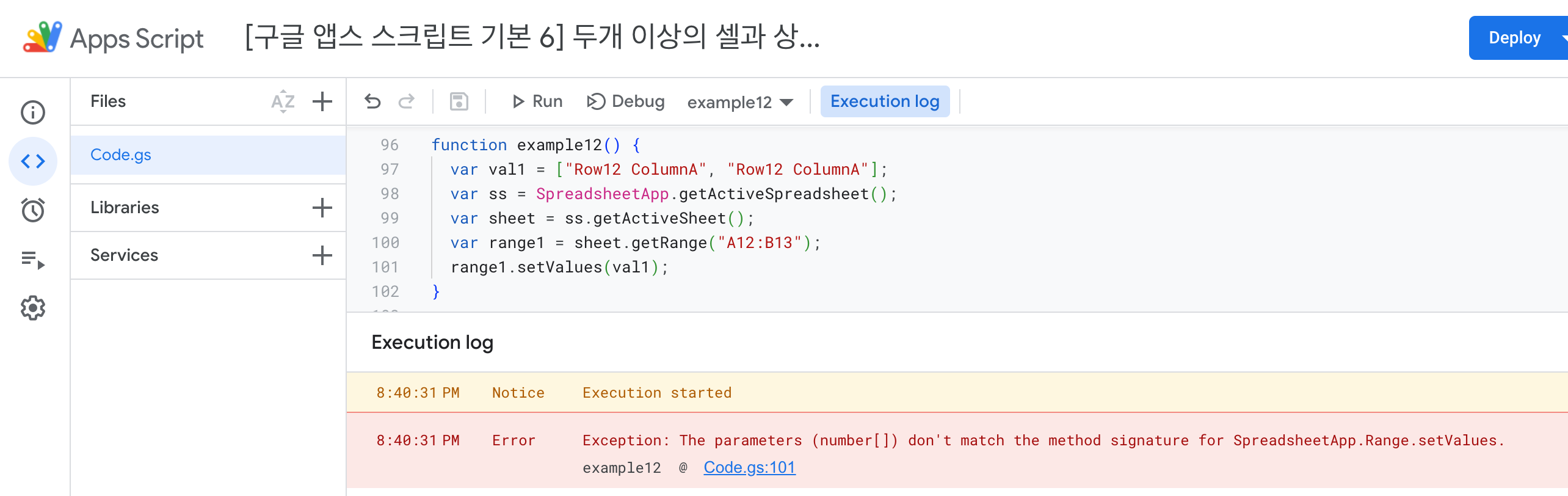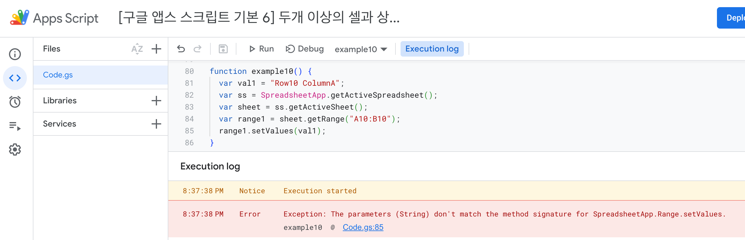 function example10() { var val1 = "Row10 ColumnA"; var ss = SpreadsheetApp.getActiveSpreadsheet(); var sheet = ss.getActiveSheet(); var range1 = sheet.getRange("A10:B10"); range1.setValues(val1); } function example11() { var val1 = 10; var ss = SpreadsheetApp.getActiveSpreadsheet(); var sheet = ss.getActiveSheet(); var range1 = sheet.getRange("A11:B11"); range1.setValues(val1); } function example12() { var val1 = ["Row12 ColumnA", "Row12 ColumnA"]; var ss = SpreadsheetApp.getActiveSpreadsheet(); var sheet = ss.getActiveSheet(); var range1 = sheet.getRange("A12:B13"); range1.setValues(val1); }가장 먼저 문자열 하나를 매개변수로 사용하는 예제인 함수 example10의 실행결과입니다. 이 함수를 실행하면 아래와 같이 매개변수로 String(문자열) 타입의 데이터가 들어갔고, 이는 SpreadsheetApp.Range.setValues. 메서드에 맞지 않는다는 사실을 실행 로그에서 확인할 수 있습니다.