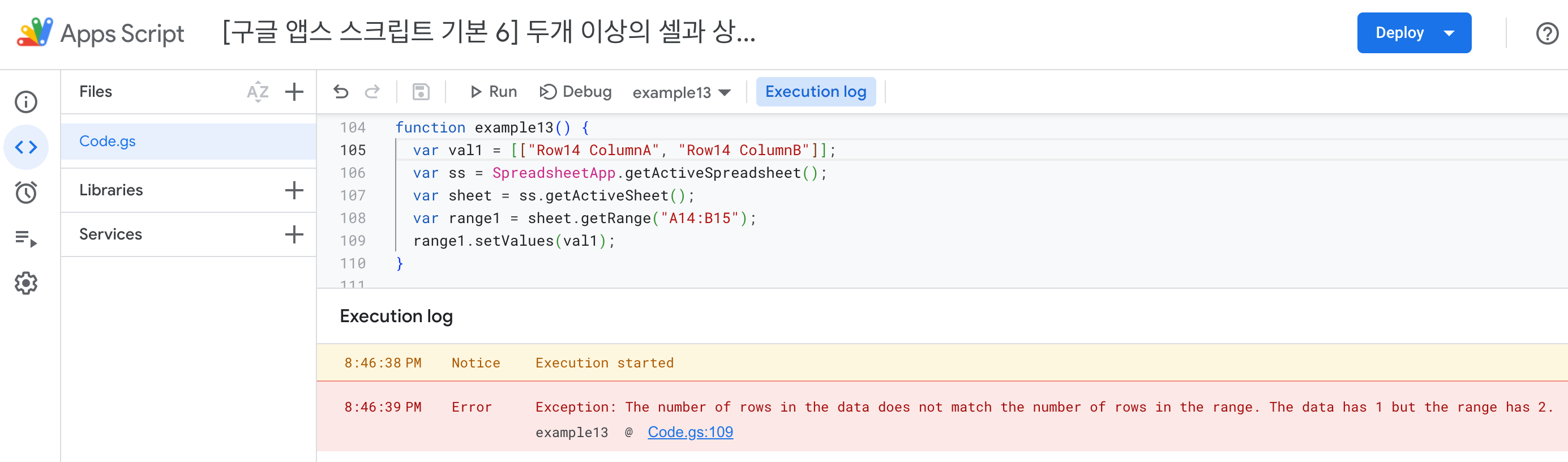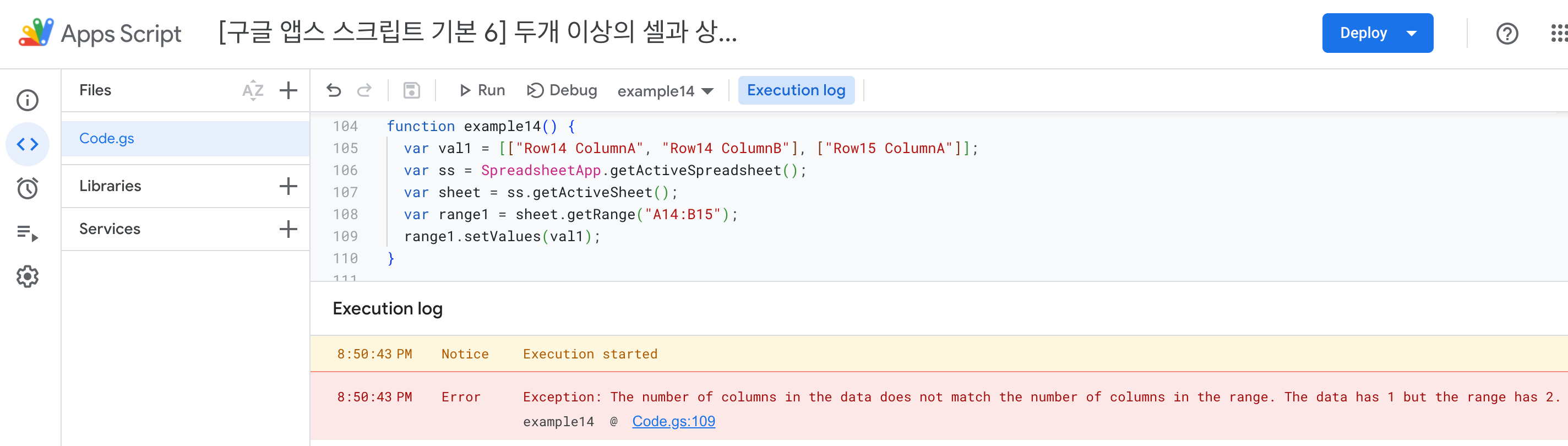 function example14() { var val1 = [["Row14 ColumnA", "Row14 ColumnB"], ["Row15 ColumnA"]]; var ss = SpreadsheetApp.getActiveSpreadsheet(); var sheet = ss.getActiveSheet(); var range1 = sheet.getRange("A14:B15"); range1.setValues(val1); }이 스크립트를 실행해보면 아까와 비슷하지만 약간은 다른 오류를 반환합니다. 아까는 행 개수가 일치하지 않는다고 했지만, 이번에는 열 개수가 일치하지 않는다는 오류를 반환합니다.