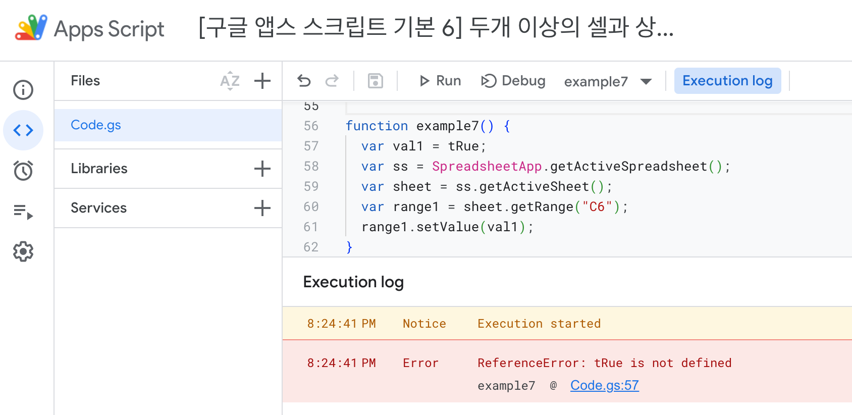 불리언 타입의 데이터를 입력하는 example7 함수에 대해 간략한 설명을 덧붙이겠습니다. 구글 앱스 스크립트에서 참/거짓을 표현하기 위해서는 따옴표 없이 true/false를 소문자로 입력해야 합니다. 만약 대문자가 하나라도 포함되어 있을 경우 구글 앱스 스크립트는 이를 참/거짓이라는 불리언 타입의 데이터가 아닌 변수로 이해합니다. 구글 시트에서는 불리언 타입의 데이터를 모두 대문자인 TRUE/FALSE로 표시합니다. 이 때문에 구글 앱스 스크립트에서 true라는 불리언 타입의 데이터를 입력했을 때, 구글 시트에는 대문자 TRUE가 나타나게 됩니다. 참고로 구글 앱스 스크립트에서 true에 대문자를 섞어 쓰면 아래와 같은 오류가 실행 로그에 나타납니다.