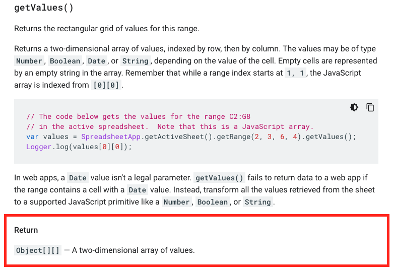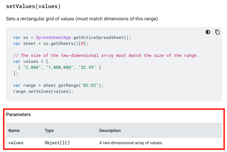 구글 앱스 스크립트 레퍼런스에서 getValue 메서드를 찾아보면 반환 값으로 Object 라는 표시와 함께 The value in this cell (이 셀의 값입니다)라는 설명을 볼 수 있습니다. 여기서 Object라는 말은 문자열/숫자 등 어떠한 객체가 있다는 말입니다. 따라서 셀의 값이 숫자면 숫자를, 문자열이면 문자열을 반환한다는 사실을 알 수 있습니다. 그런데 getValues 메서드에 대한 반환 값은 약간 다릅니다. getValues의 반환 값은 Object [][]라는 표시와 함께 A two-dimensional array of values(값의 2차원 배열입니다)라는 설명이 있습니다. 마찬가지로 구글 앱스 스크립트 레퍼런스에서 setValue(s)에 대한 설명을 찾아보겠습니다. 하나의 값을 입력하는 setValue 메서드의 경우 매개변수로 getValue의 반환 값과 같은 Object를 이용한다는 것을 알 수 있습니다. 여러 값을 입력하는 setValues 메서드의 경우 getValues의 반환값과 같은 two-dimensional array(2차원 배열)를 매개변수로 이용한다는 것을 알 수 있습니다.
