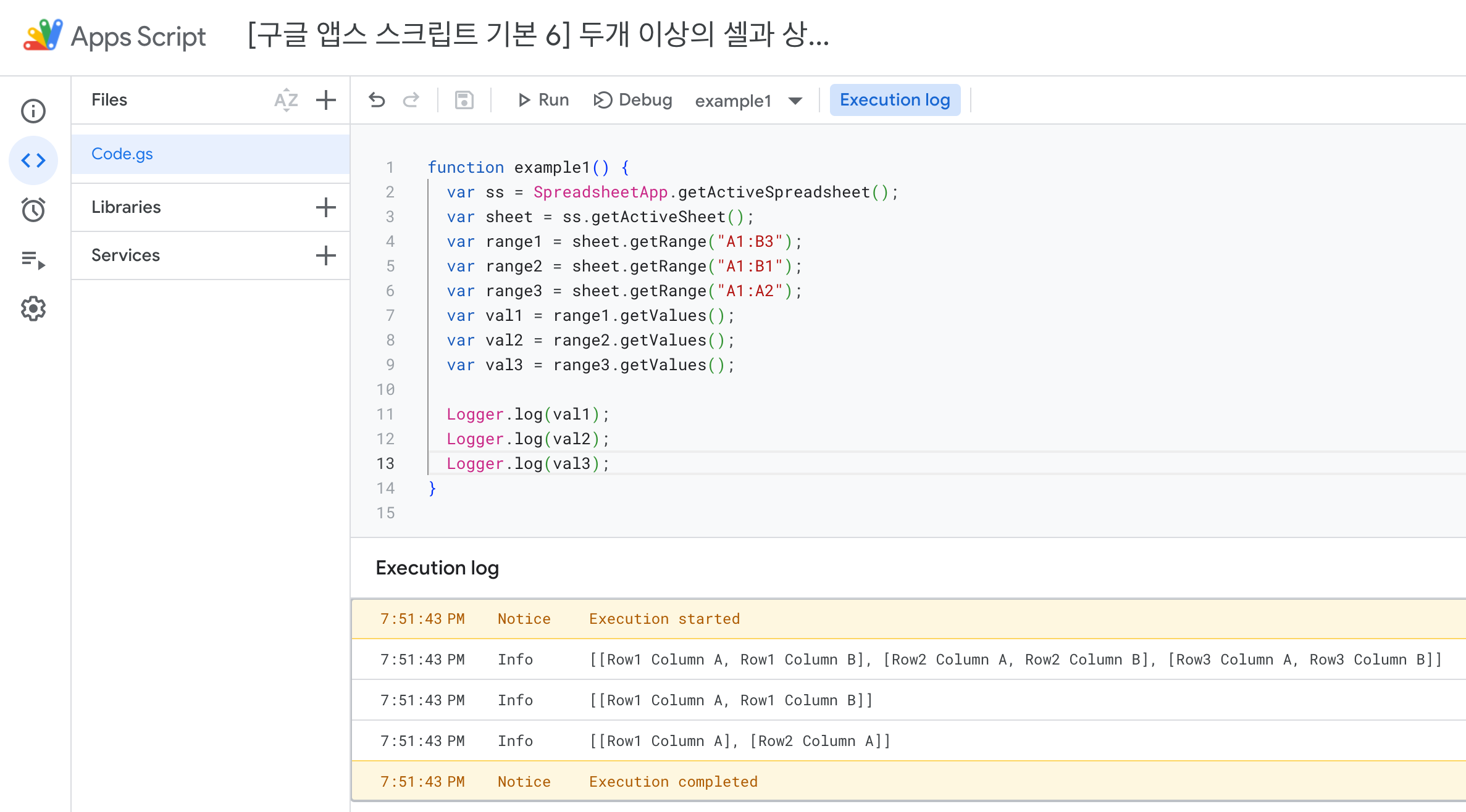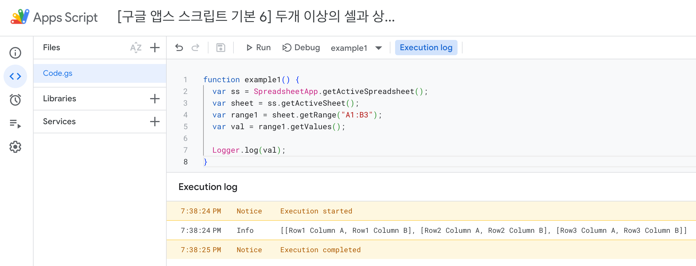 function example1() { var ss = SpreadsheetApp.getActiveSpreadsheet(); var sheet = ss.getActiveSheet(); var range1 = sheet.getRange("A1:B3"); var val = range1.getValues(); Logger.log(val); }
