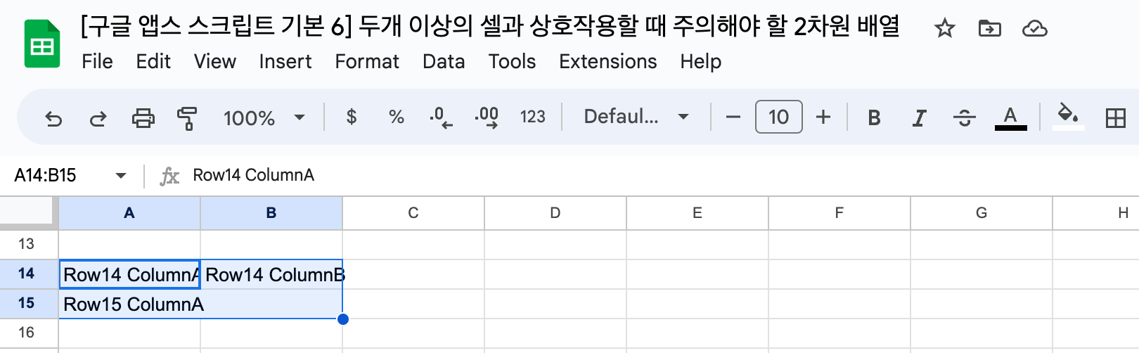 function example15() { var val1 = [["Row14 ColumnA", "Row14 ColumnB"], ["Row15 ColumnA", ""]]; var ss = SpreadsheetApp.getActiveSpreadsheet(); var sheet = ss.getActiveSheet(); var range1 = sheet.getRange("A14:B15"); range1.setValues(val1); }위의 코드를 실행해보면 example14 함수와는 달리 오류 없이 작동하고, 아래의 스크린숏처럼 원하는 값이 원하는 위치에 들어갔다는 사실을 확인할 수 있습니다.