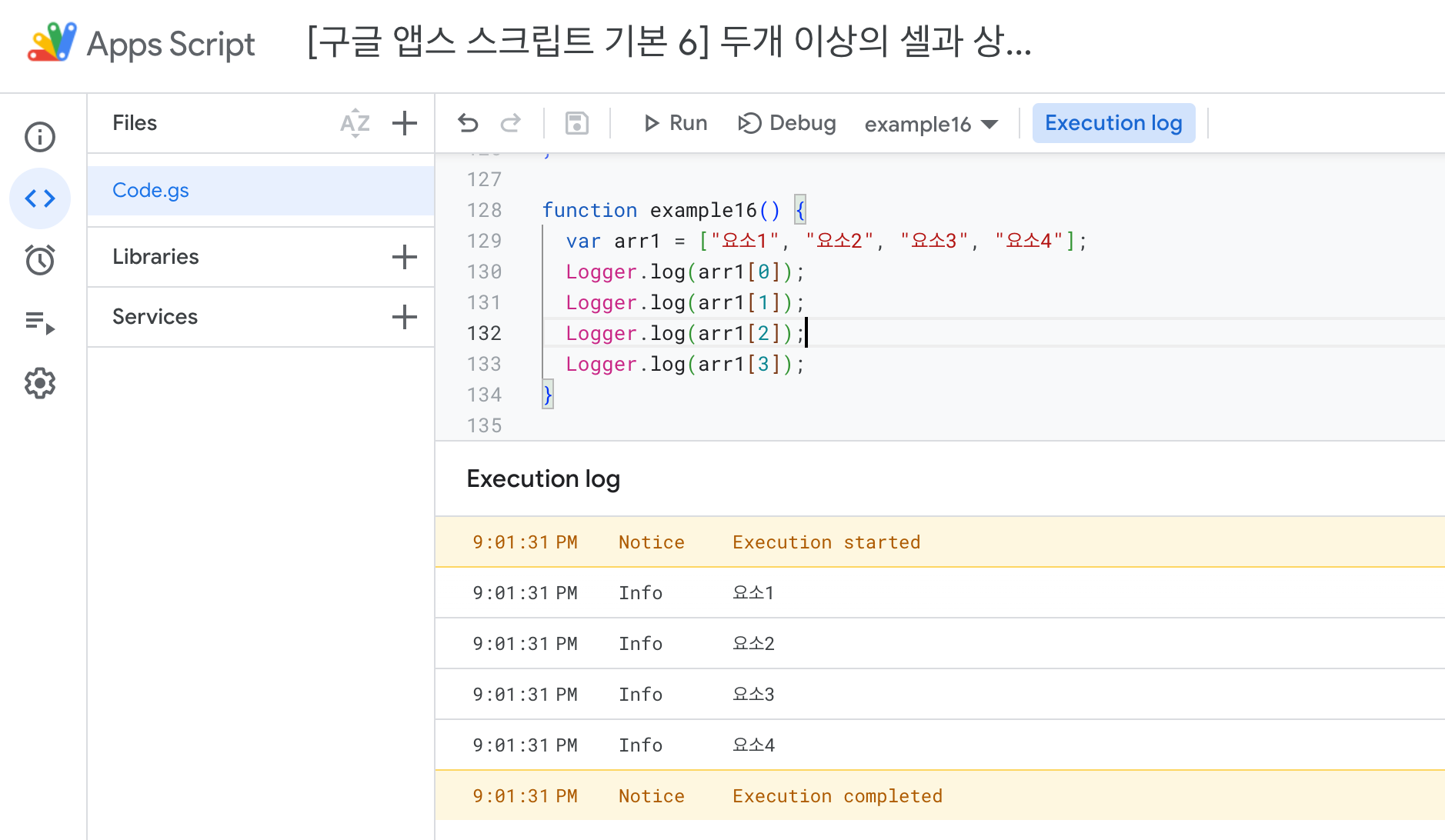 function example16() { var arr1 = ["요소1", "요소2", "요소3", "요소4"]; Logger.log(arr1[0]); Logger.log(arr1[1]); Logger.log(arr1[2]); Logger.log(arr1[3]); }