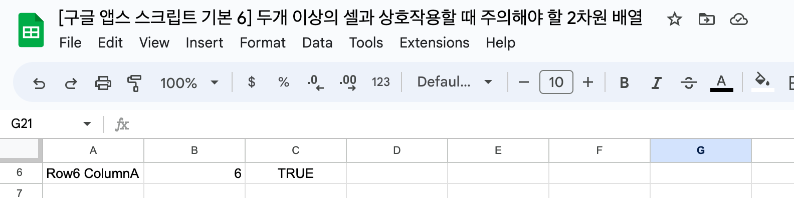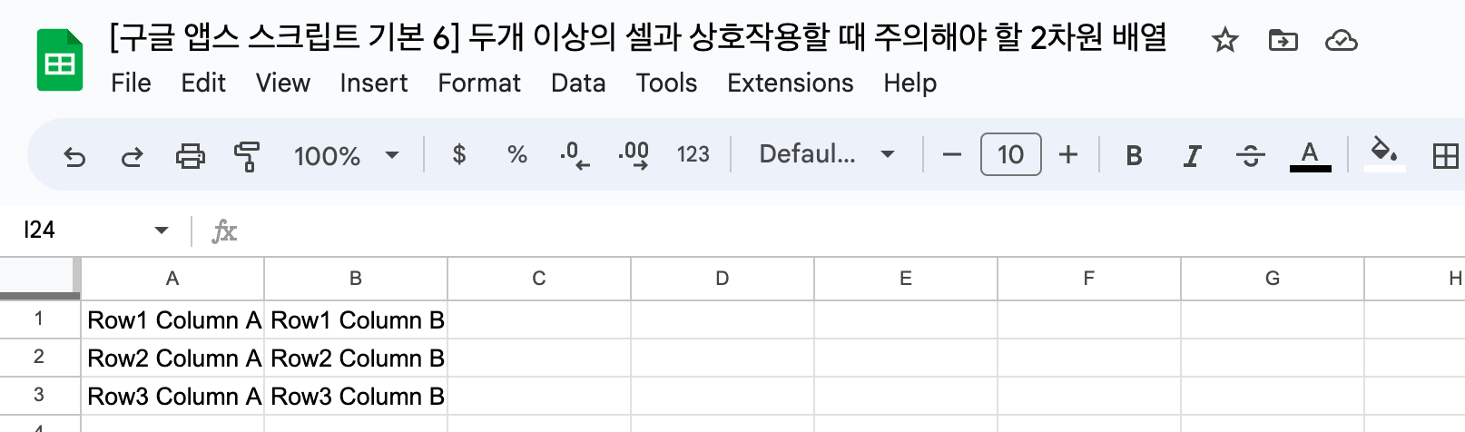 [구글 앱스 스크립트 기본 6] 두개 이상의 셀과 상호작용할 때 주의해야 할 2차원 배열공부/구글 앱스 스크립트 2023. 8. 6. 19:16