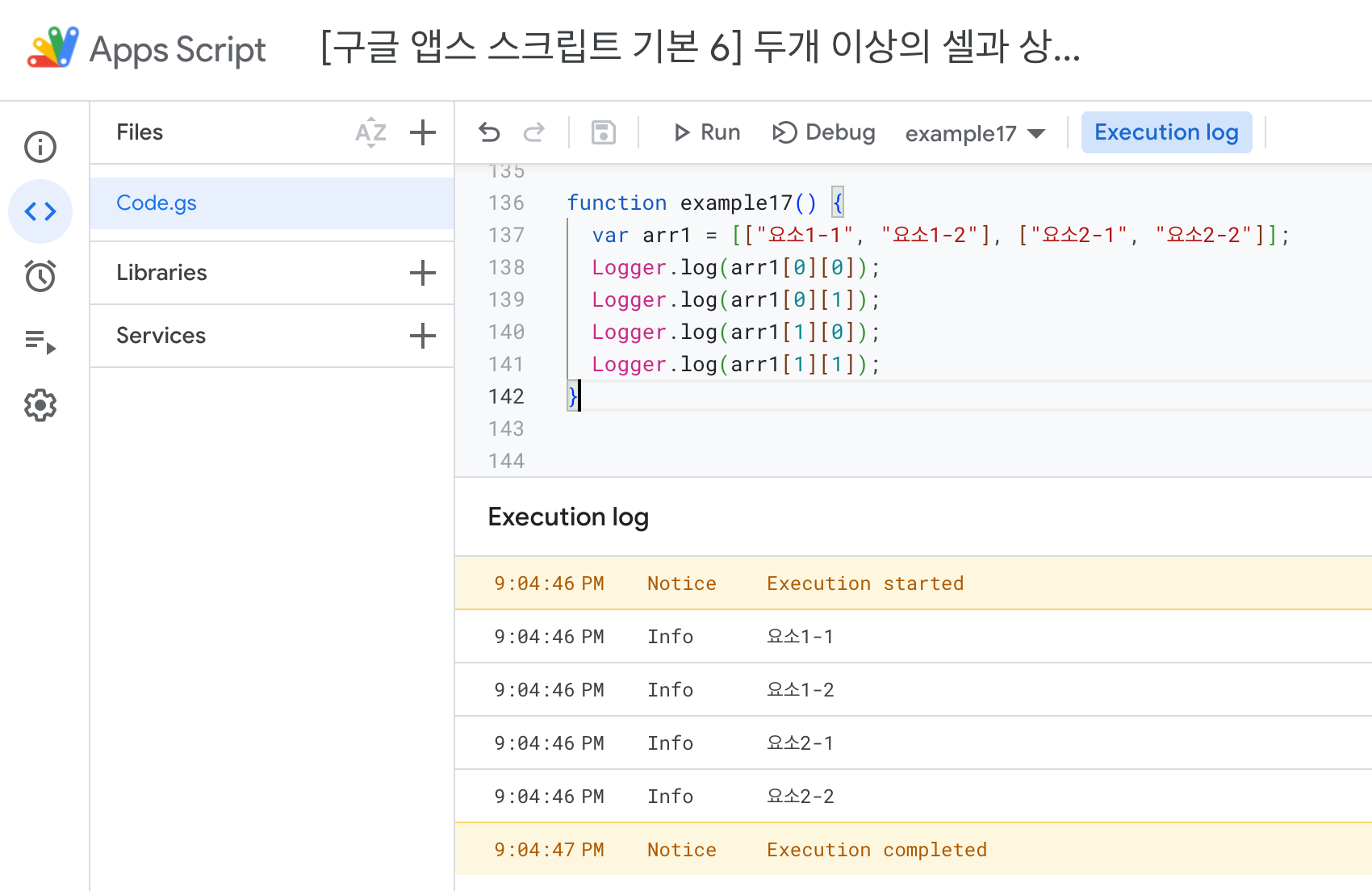 function example17() { var arr1 = [["요소1-1", "요소1-2"], ["요소2-1", "요소2-2"]]; Logger.log(arr1[0][0]); Logger.log(arr1[0][1]); Logger.log(arr1[1][0]); Logger.log(arr1[1][1]); }