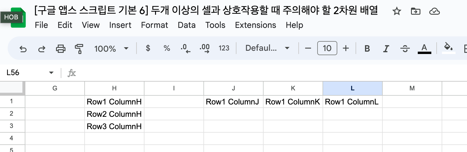 더보기function example3() { var array1 = [["Row1 ColumnH"], ["Row2 ColumnH"], ["Row3 ColumnH"]]; var ss = SpreadsheetApp.getActiveSpreadsheet(); var sheet = ss.getActiveSheet(); var range1 = sheet.getRange("H1:H3"); range1.setValues(array1); } function example4() { var array1 = [["Row1 ColumnJ", "Row1 ColumnK", "Row1 ColumnL"]]; var ss = SpreadsheetApp.getActiveSpreadsheet(); var sheet = ss.getActiveSheet(); var range1 = sheet.getRange("J1:L1"); range1.setValues(array1); }
