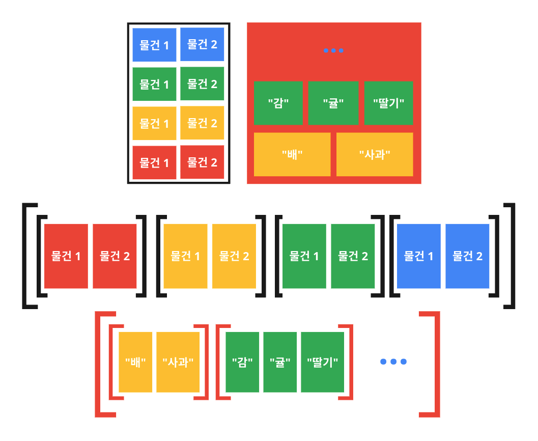 만약 한 단에 물건을 하나가 아닌 여러개를 쌓는다면 어떻게 될까요? 각각의 단에 물건을 1X2형태로 박스에 담아, 그 박스를 다시 하나의 커다란 박스에 담는 상황을 상상해 봅시다. 각각의 단에 들어가는 박스는 물건을 넣은 순서에 따라 [물건 1, 물건 2] 형태로 존재하게 됩니다. 첫 번째 박스도 [물건 1, 물건 2], 두 번째 박스도 [물건 1, 물건 2], 마지막 박스인 네 번째 박스도 [물건 1, 물건 2] 형태로 적재되어 있습니다. 이제 이 박스들을 커다란 박스에 다시 넣습니다. 그러면 이 작은 박스들은 커다란 박스에 들어가는 순서에 따라 [[물건 1, 물건 2], [물건 1, 물건 2], [물건 1, 물건 2], [물건 1, 물건 2]] 형태를 띠게 됩니다. 이와 같이 배열 안에 다른 배열이 들어가 있는 배열이 2차원 배열입니다. 만약 각기 다른 문자열인 과일이름이 들어간 2차원 배열을 만든다면 [["배", "사과"], ["감", "귤", "딸기"],...]와 같은 형태가 됩니다. 1차원 배열에서 배열 안에 들어가 있는 요소들 수에 제한이 없는 것처럼, 2차원 배열에서도 배열 안의 배열에 들어가는 요소들의 수와 더불어, 배열 안에 들어가는 배열의 수도 제한이 없고 수를 일치시킬 필요도 없습니다.