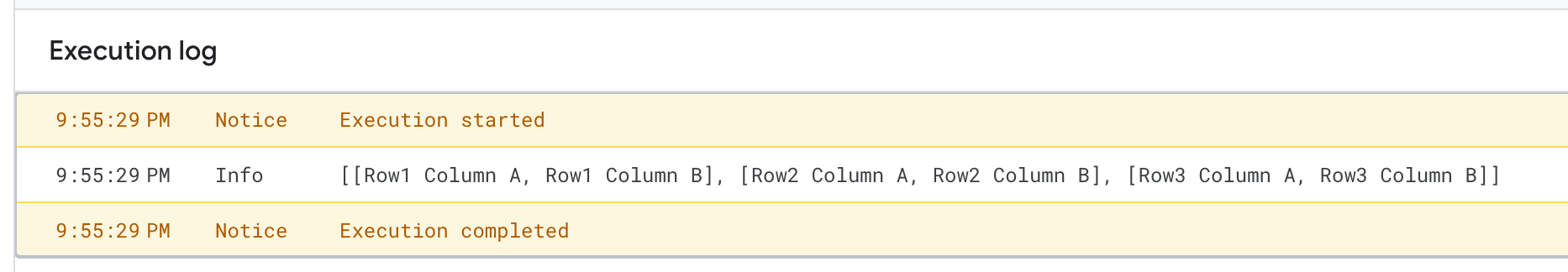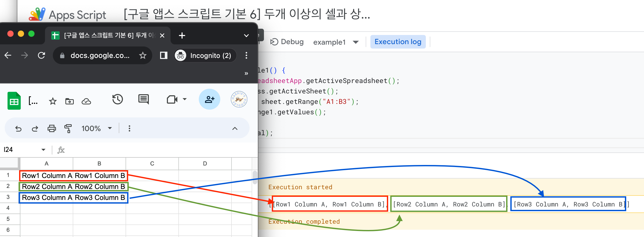 우리는 "A1:B3" 범위에 있는 정보를 구글 앱스 스크립트로 불러올겁니다. 각각의 셀에는 행 번호와 열 이름이 들어가 있습니다. 위의 example1 코드를 실행하면 실행 로그를 통해 확인되는 로그는 아래와 같습니다.