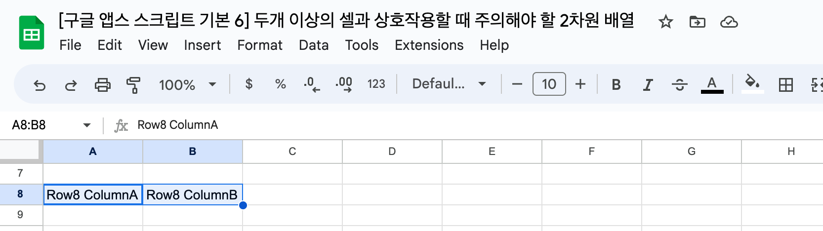 function example8() { var val1 = [ "Row8 ColumnA", "Row8 ColumnB"]; var ss = SpreadsheetApp.getActiveSpreadsheet(); var sheet = ss.getActiveSheet(); var range1 = sheet.getRange("A8"); range1.setValue(val1); } function example9() { var val1 = [[ "Row8 ColumnB", "Row8 ColumnC"], [ "Row9 ColumnB", "Row7 ColumnC"]]; var ss = SpreadsheetApp.getActiveSpreadsheet(); var sheet = ss.getActiveSheet(); var range1 = sheet.getRange("ㅠ8"); range1.setValue(val1); }위의 스크립트를 실행해보면 오류 없이 함수가 실행되는 것을 볼 수 있습니다. 또한 setValue 메서드는 배열의 구조와 상관없이 가장 앞에 오는 요소를 선택된 범위에 입력한다는 사실을 알 수 있습니다.
