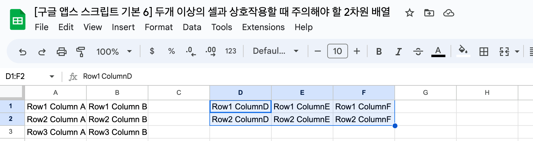 function example2() { var array1 = [["Row1 ColumnD", "Row1 ColumnE", "Row1 ColumnF"],["Row2 ColumnD", "Row2 ColumnE", "Row2 ColumnF"]]; var ss = SpreadsheetApp.getActiveSpreadsheet(); var sheet = ss.getActiveSheet(); var range1 = sheet.getRange("D1:F2"); range1.setValues(array1); }위의 코드를 실행해보면 아래와 같이 우리가 작성한 배열이 원하는 범위에 정확히 들어간 것을 알 수 있습니다.