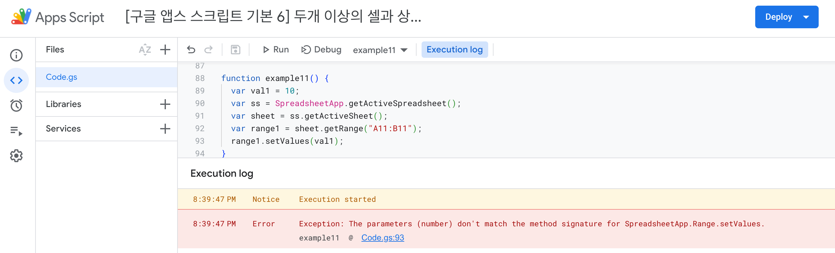 function example10() { var val1 = "Row10 ColumnA"; var ss = SpreadsheetApp.getActiveSpreadsheet(); var sheet = ss.getActiveSheet(); var range1 = sheet.getRange("A10:B10"); range1.setValues(val1); } function example11() { var val1 = 10; var ss = SpreadsheetApp.getActiveSpreadsheet(); var sheet = ss.getActiveSheet(); var range1 = sheet.getRange("A11:B11"); range1.setValues(val1); } function example12() { var val1 = ["Row12 ColumnA", "Row12 ColumnA"]; var ss = SpreadsheetApp.getActiveSpreadsheet(); var sheet = ss.getActiveSheet(); var range1 = sheet.getRange("A12:B13"); range1.setValues(val1); }가장 먼저 문자열 하나를 매개변수로 사용하는 예제인 함수 example10의 실행결과입니다. 이 함수를 실행하면 아래와 같이 매개변수로 String(문자열) 타입의 데이터가 들어갔고, 이는 SpreadsheetApp.Range.setValues. 메서드에 맞지 않는다는 사실을 실행 로그에서 확인할 수 있습니다.
