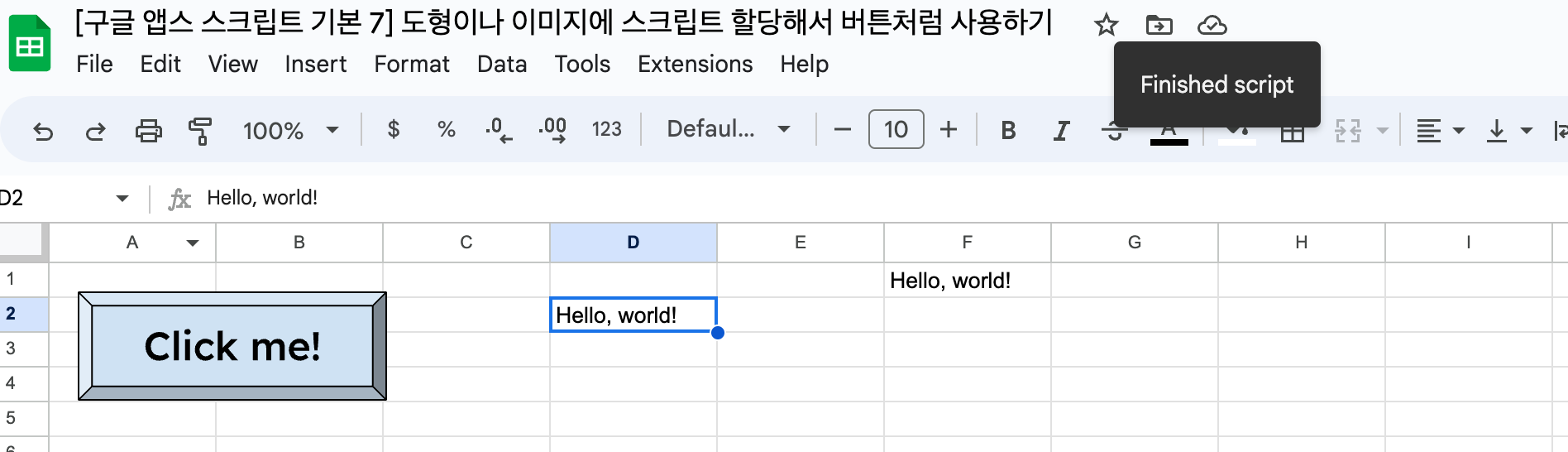 위의 이미지처럼 D2의 값인 "Hello, world!" 문자열이 F1 셀에 삽입된 것을 확인할 수 있습니다. 또한 스크립트 실행 중에 구글 시트 파일 중앙 상단에 스크립트가 실행 중이라는 안내가 뜨고, 스크립트 실행이 끝나면 위의 이미지처럼 스크립트가 종료되었다는 안내가 뜹니다. 만약 D2셀이 아닌 다른 셀에 다른 값을 입력한 후 그 셀을 선택하고 Click me! 도형을 누르게 되면 그 셀의 값이 F1셀에 들어가는 것을 확인할 수 있습니다.