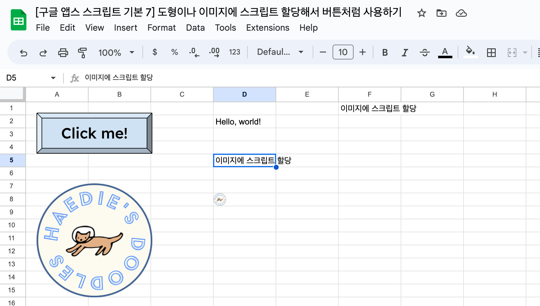 이번에는 D5 셀에 "이미지에 스크립트 할당"이라는 텍스트를 입력하겠습니다. 이후 스크립트가 할당된 이미지를 클릭해 스크립트를 실행하면 아래와 같은 결과를 얻을 수 있습니다.