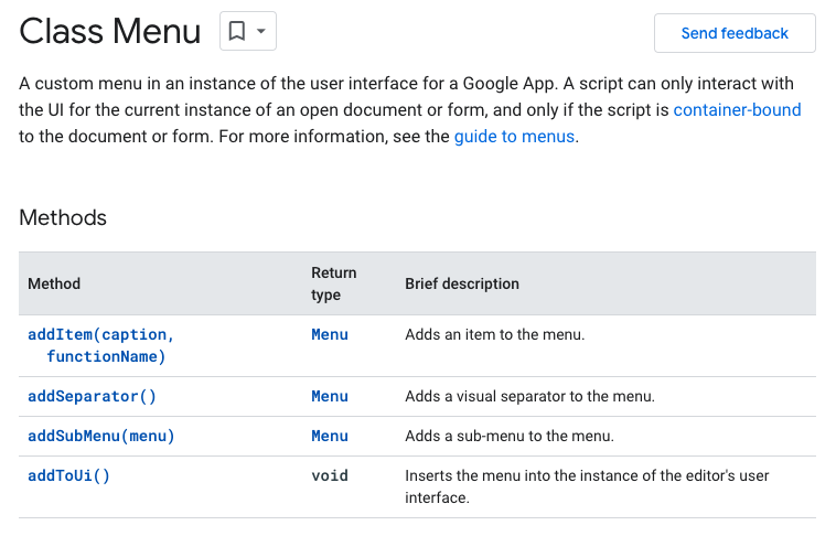 Class Menu의 Methods 구글 앱스 스크립트 레퍼런스 (c) google.com Class Ui와 Class Menu를 이용해 커스텀 메뉴(맞춤 메뉴 항목) 만들기