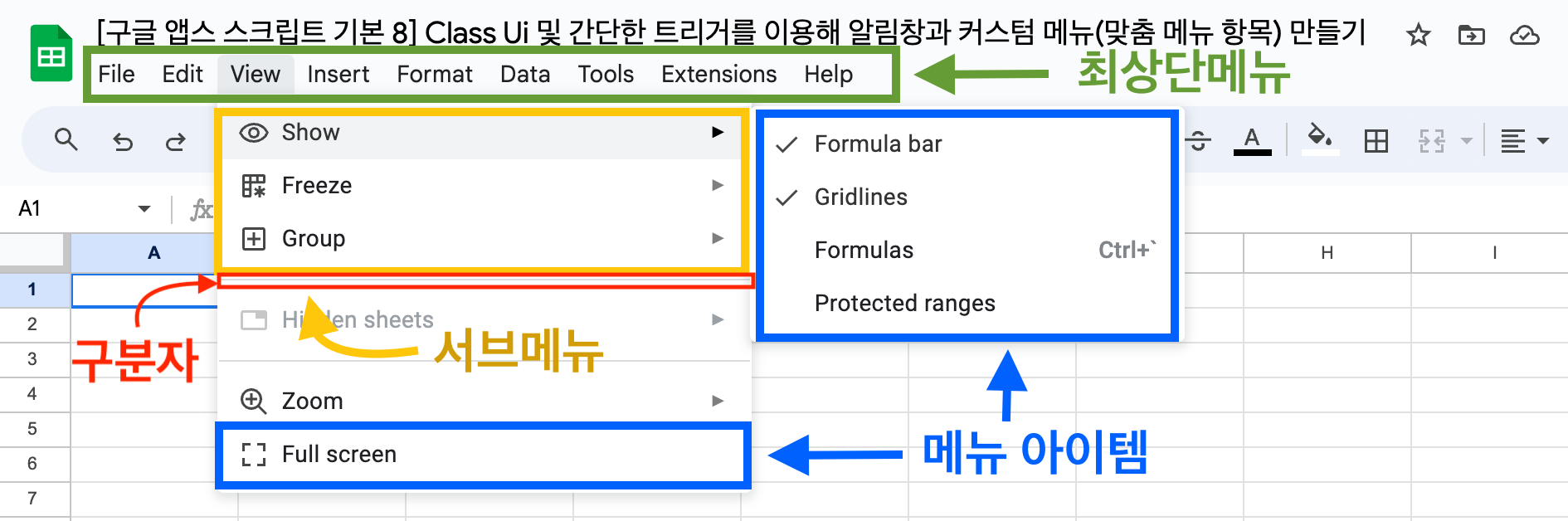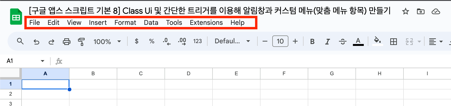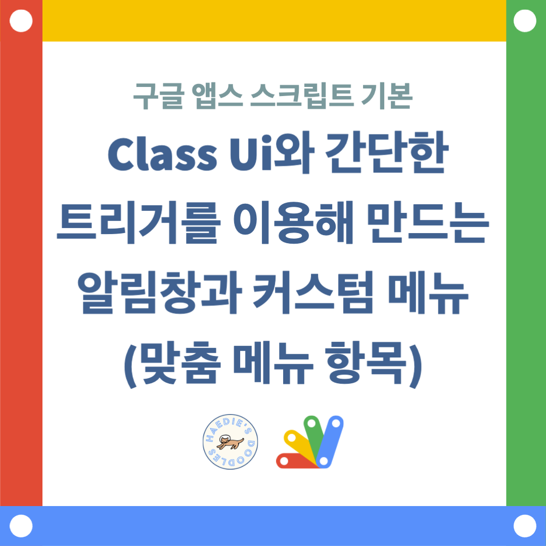 [구글 앱스 스크립트 기본 8] Class Ui 및 간단한 트리거를 이용해 알림창과 커스텀 메뉴(맞춤 메뉴 항목) 만들기 글의 순서
