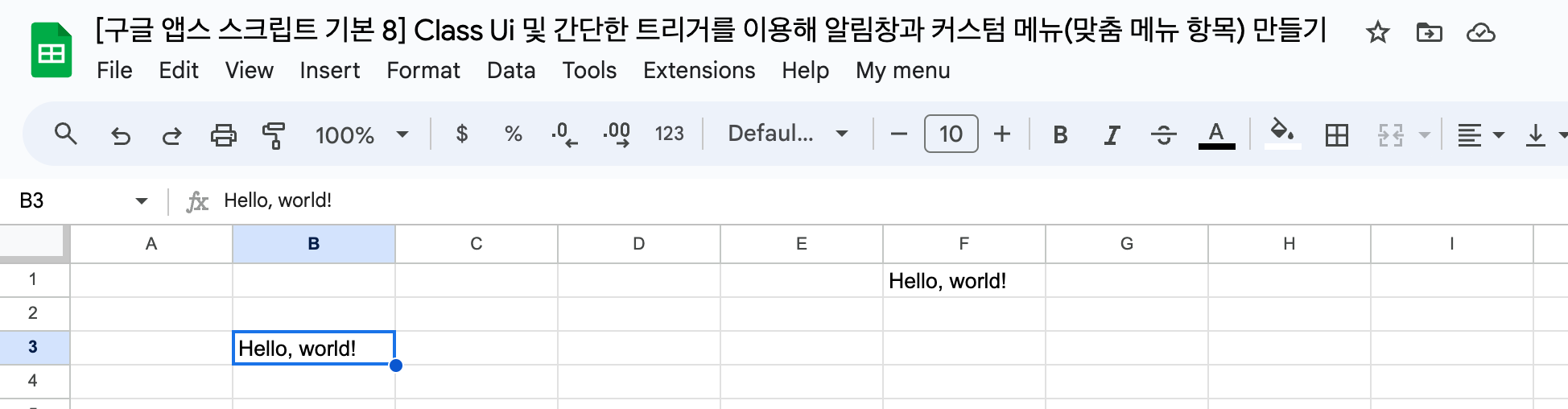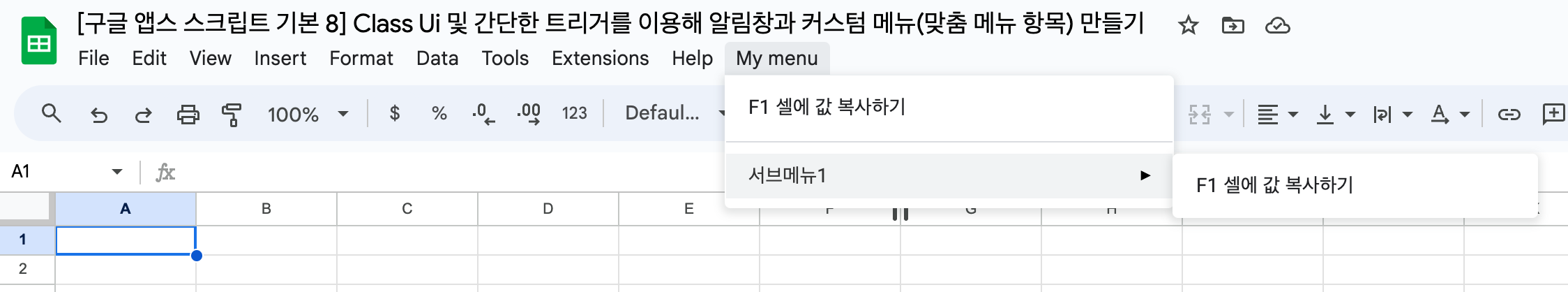 function onOpen(e) { SpreadsheetApp.getUi() .createMenu('My menu') .addItem("F1 셀에 값 복사하기", "example1") .addSeparator() .addSubMenu(SpreadsheetApp.getUi().createMenu("서브메뉴1") .addItem("F1 셀에 값 복사하기", "example1")) .addToUi(); } function example1() { var ss = SpreadsheetApp.getActiveSpreadsheet(); var sheet = ss.getActiveSheet(); var range1 = sheet.getCurrentCell(); var val1 = range1.getValue(); var range2 = sheet.getRange(1,6); range2.setValue(val1); }위의 코드를 저장한 후 스크립트와 구글 시트 파일을 닫은 후, 다시 해당 구글 시트 파일을 열어보면 아래의 이미지처럼 최상단 메뉴 제일 왼쪽에 우리가 만든 새로운 메뉴가 들어가 있는 걸 볼 수 있습니다. 단, 열자마자 바로 보이는 건 아니고, 구글 시트 에디터를 완전히 로딩한 후 우리가 만든 스크립트를 통해 메뉴가 만들어지기 때문에, 파일을 열고나서 메뉴가 보이기까지 수 초가 소요될 수도 있습니다.