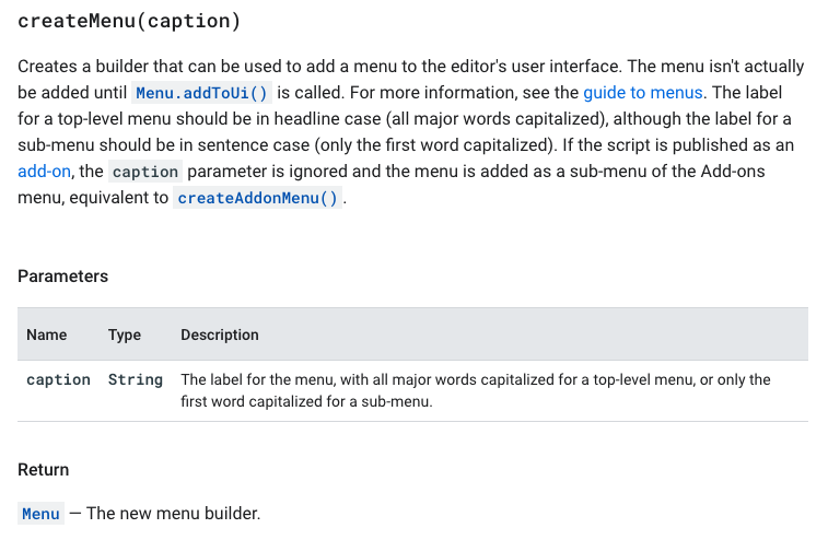 Class Menu의 Methods 구글 앱스 스크립트 레퍼런스 (c) google.com Class Ui와 Class Menu를 이용해 커스텀 메뉴(맞춤 메뉴 항목) 만들기