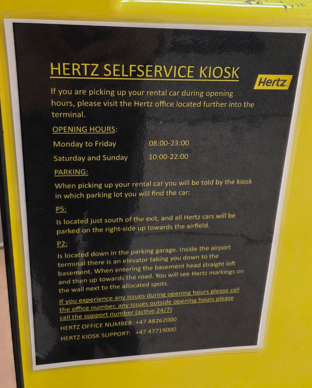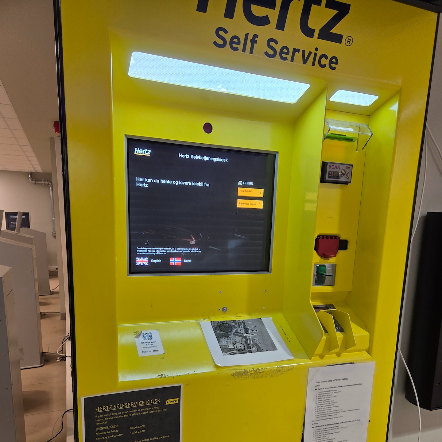 허츠 트롬쇠 공항점 키오스크 - 위에서 언급한대로 허츠 트롬쇠 공항 지점에서는 영업시간 외에 차량을 수령하고 반납할 수 있습니다. 이를 위해서는 신용카드 사이즈의 영문 운전면허증과 신용카드가 필요합니다.