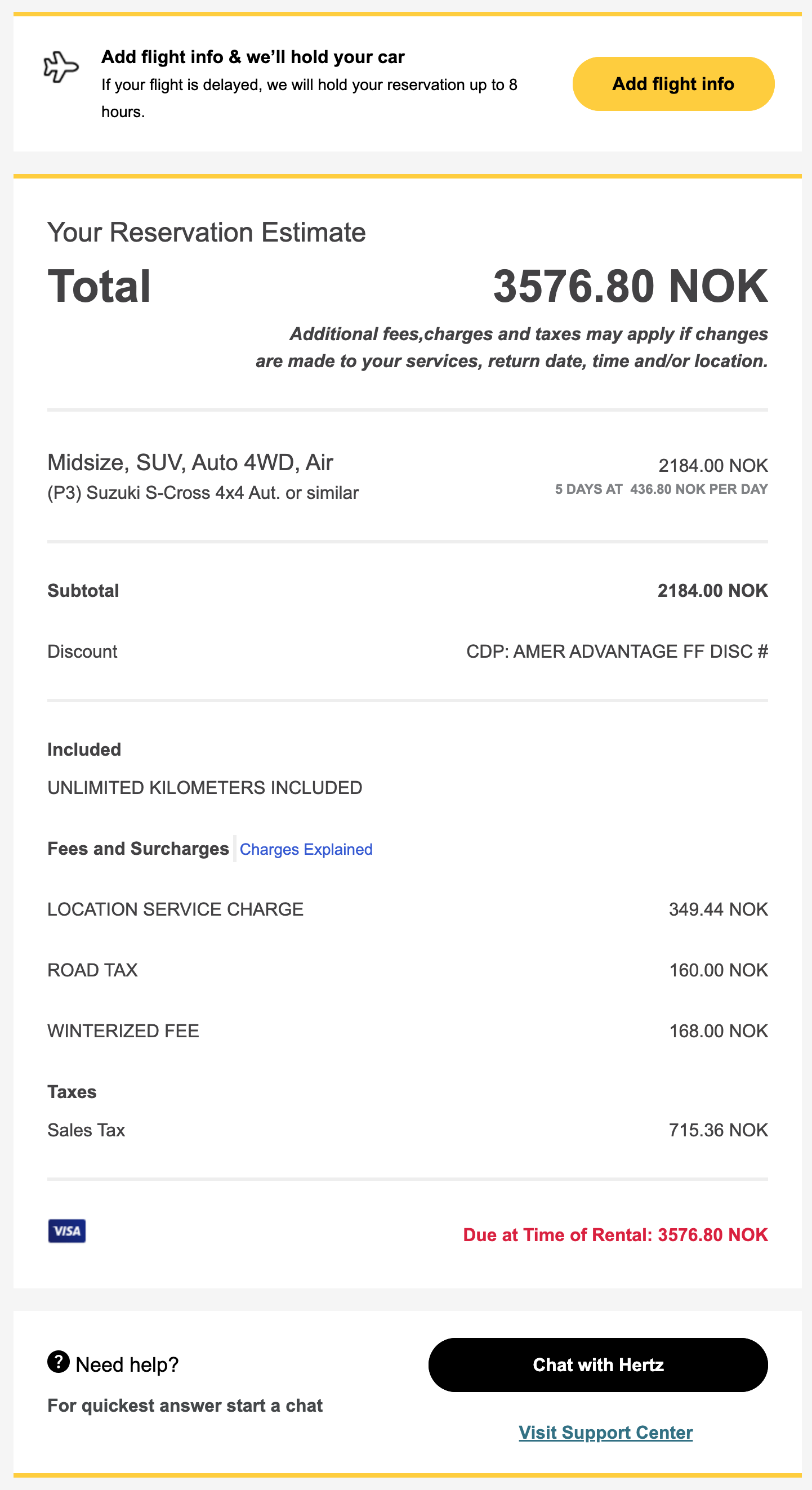 허츠 렌터카 예약 내역 - 저는 총 5일을 빌렸고 대여 요금은 총 3576.8 크로네(약 52만원)였습니다. 취소가 가능한 요금이었고 대여한 차종은 Midsize SUV, Auto, 4WD 였습니다. 예약할 때 홈페이지에서 해당 차량 등급으로 안내되는 대표 차종은 스즈키 S-Cross 4x4 였습니다. 사실 이 차량이 Midsize는 아닌 것 같은데, 유럽에서는 전반적으로 차량이 작기 때문에 이 차량도 Midsize로 분류되는 것 같습니다. 한국 기준으로는 코나, 셀토스 등 소형 SUV 정도라고 생각하시면 될 것 같습니다. 가장 처음에 검색했을 때는 2500 크로네 정도였는데 여행에 가까워서 예약을 하다 보니 조금 더 비싸진 3500 크로네 정도에 예약을 했습니다.