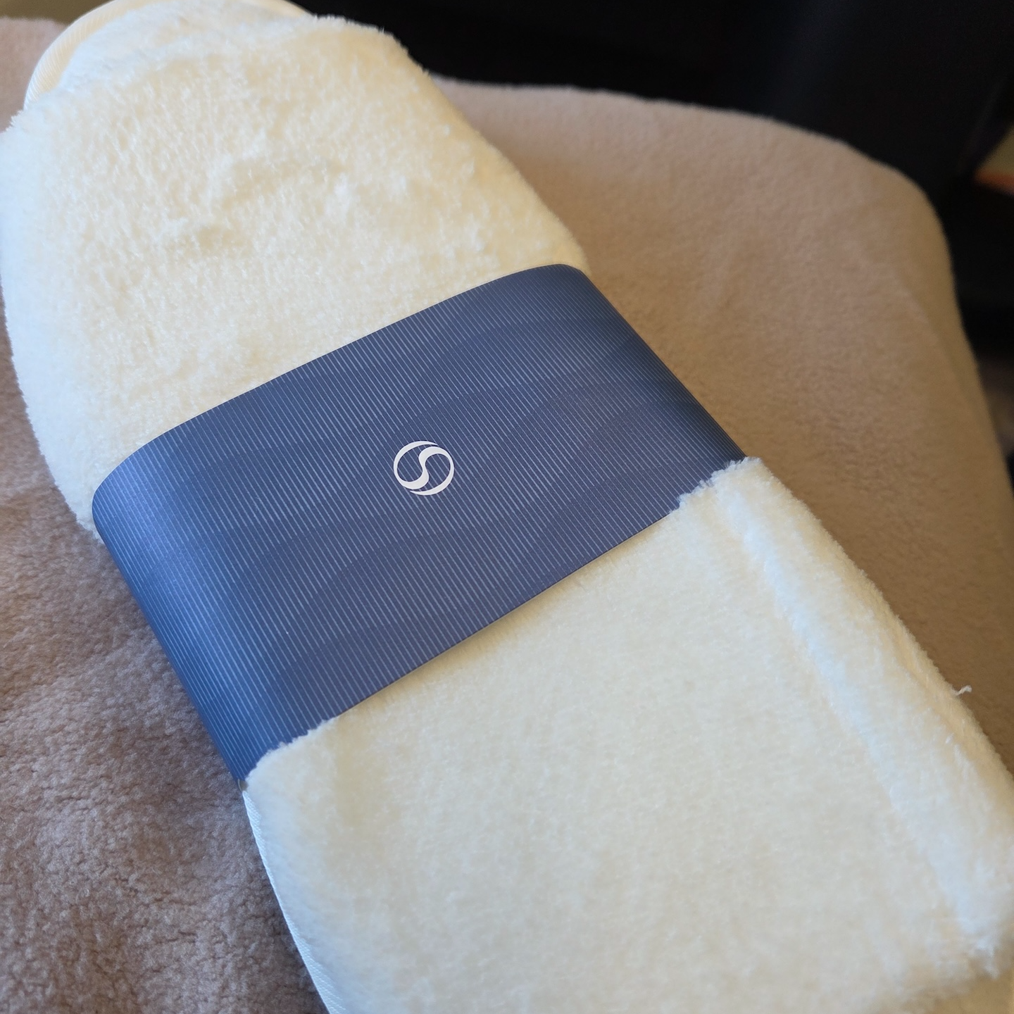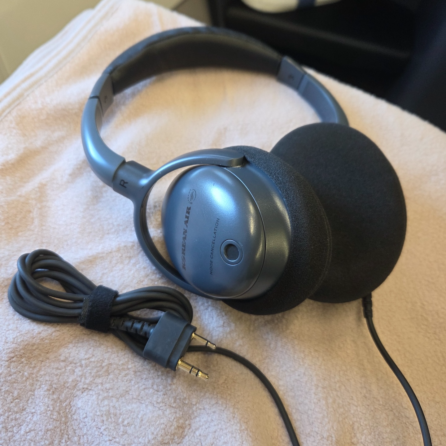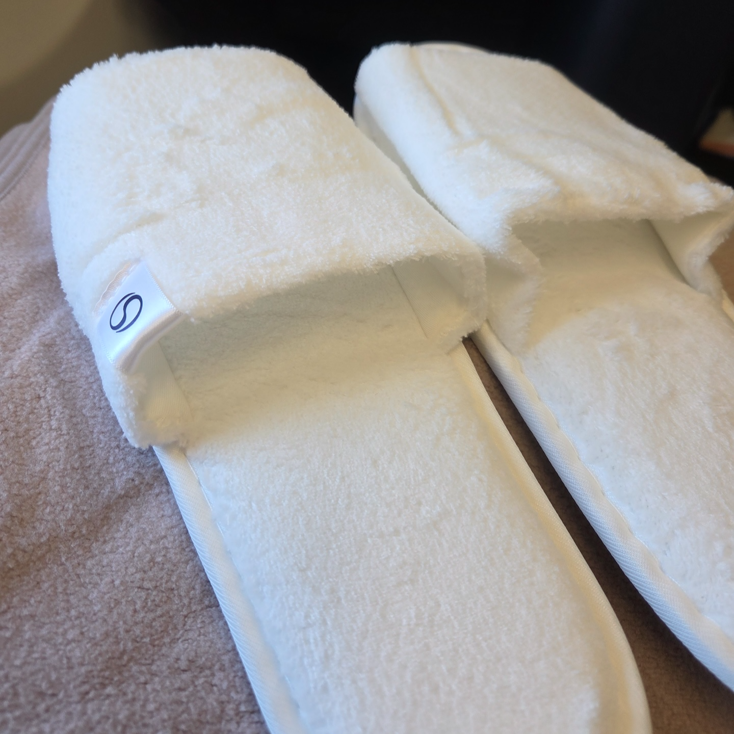 대한항공 A321neo 프레스티지 클래스 어매니티 단거리 프레스티지석 어매니티로는 슬리퍼, 담요, 노이즈 캔슬링 헤드셋이 기본 제공되었습니다. 우선 슬리퍼는 새롭게 리뉴얼되어 기존보다 훨씬 도톰하고 부드러운 흰색 제품으로 바뀌어 만족스러웠습니다. 반면 담요와 헤드셋은 여전히 대한항공의 구형 로고가 들어간 예전 모델이었는데, 특히 담요는 모포 같은 느낌에 보풀도 많이 남아 있어 리뉴얼된 슬리퍼와는 대조를 이뤘습니다.