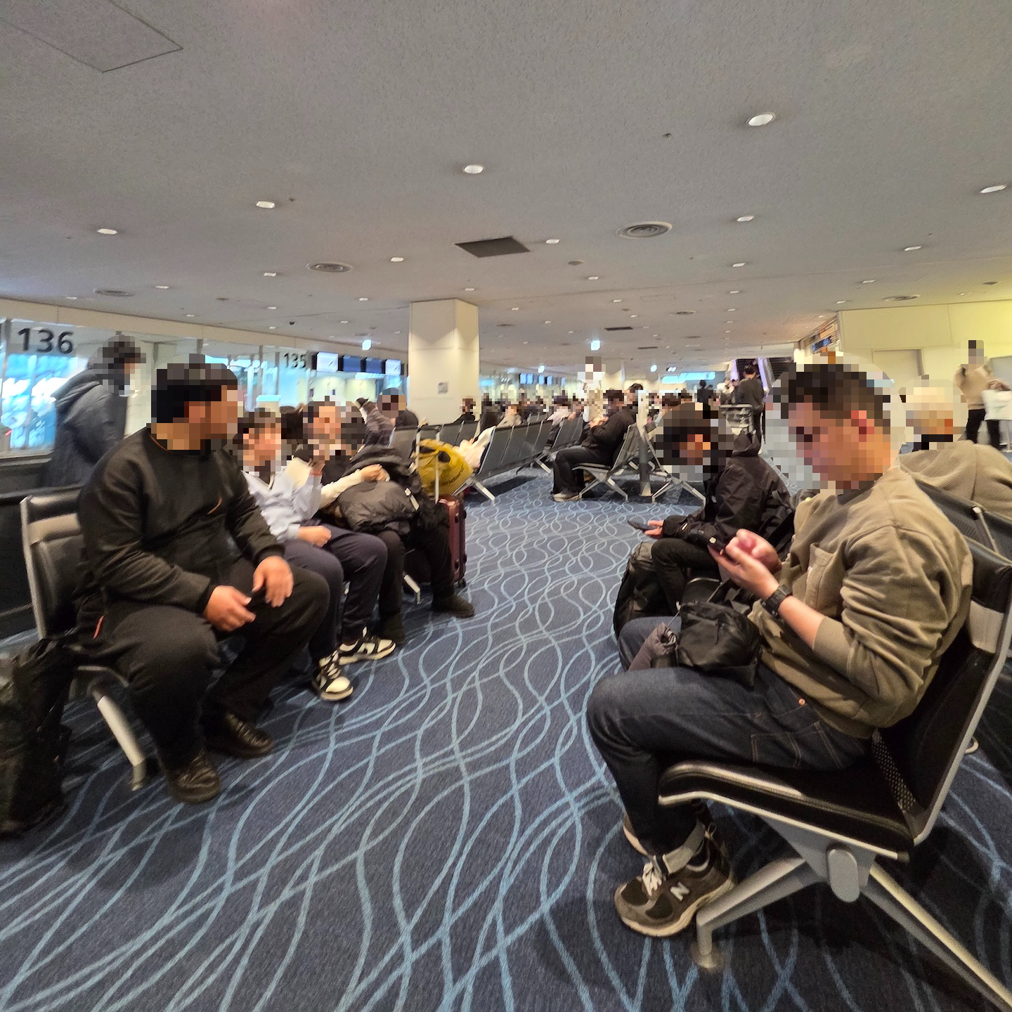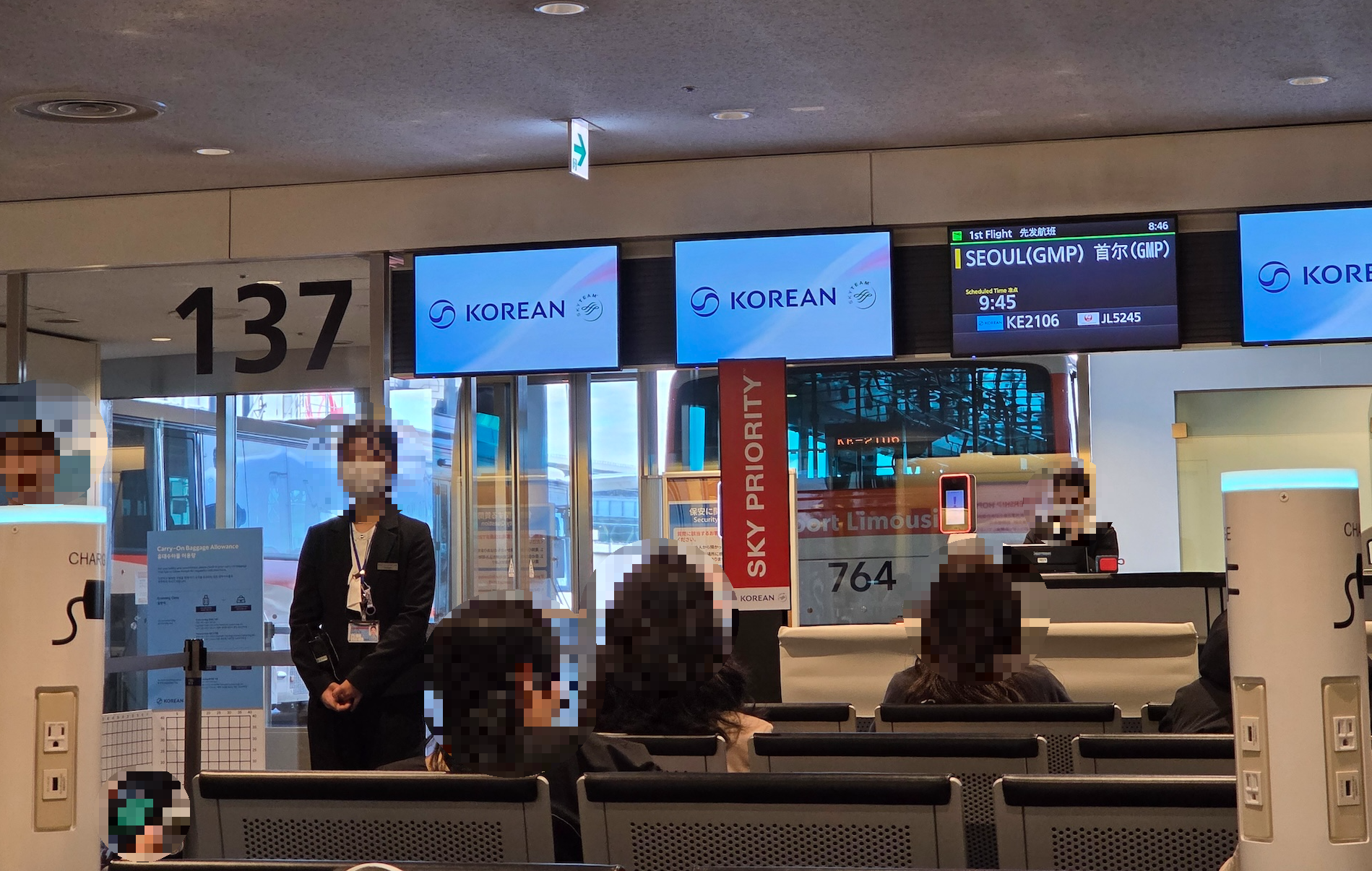 도쿄 하네다 국제공항 137번 게이트 앞 137번 게이트는 지상층에 위치해 131~139번 게이트 승객들이 함께 버스를 기다리게 됩니다. 9개의 게이트가 몰려 있는 데 비해 대기 공간이 협소해 상당히 붐비고 혼잡했습니다. 특히 비슷한 시간대에 출발하는 항공편이 많아 안내 방송이 서로 겹쳐 들렸고, 음량 자체도 충분치 않아 정확한 정보를 파악하기 어렵다는 아쉬움이 있었습니다.