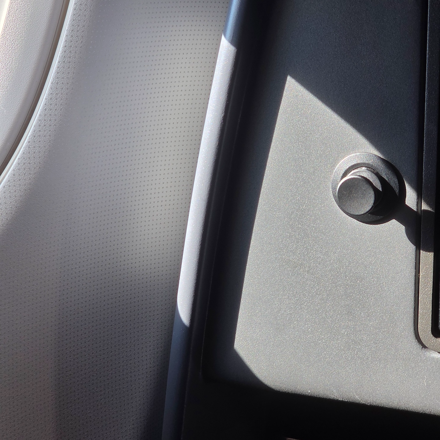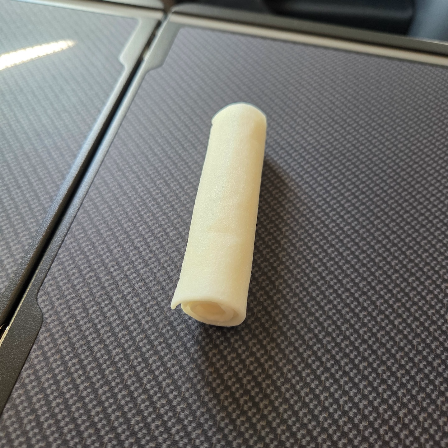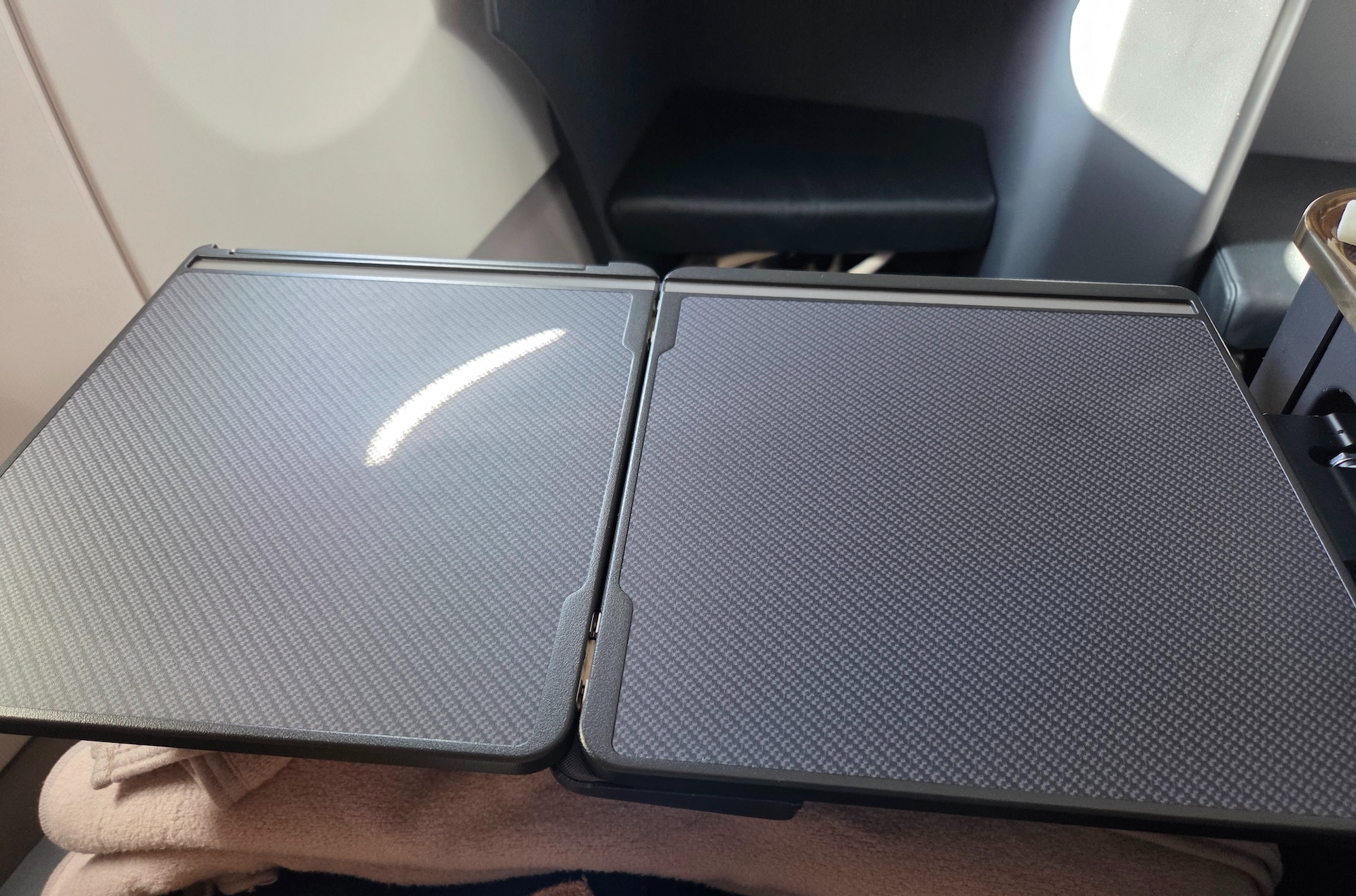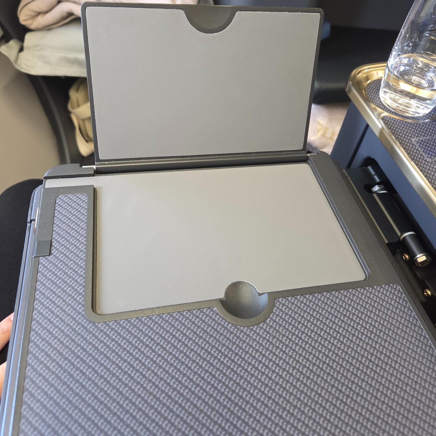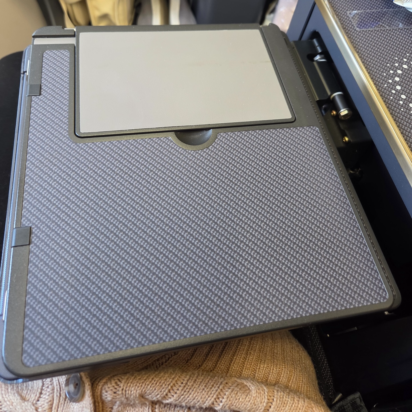 대한항공 A321neo 프레스티지 클래스 7A 좌석 테이블 테이블은 팔걸이 아래에서 꺼내 사용하는 폴딩 방식입니다. 한 번 접은 상태에서는 스마트폰이나 태블릿 거치대로 쓸 수 있고, 펼치면 기내식 트레이나 노트북을 두기에 충분한 크기가 됩니다. 다만 테이블의 카본 패턴 마감이 프린팅이라는 티가 너무 선명하게 난다는 점은 디자인적 완성도 면에서 아쉽습니다.