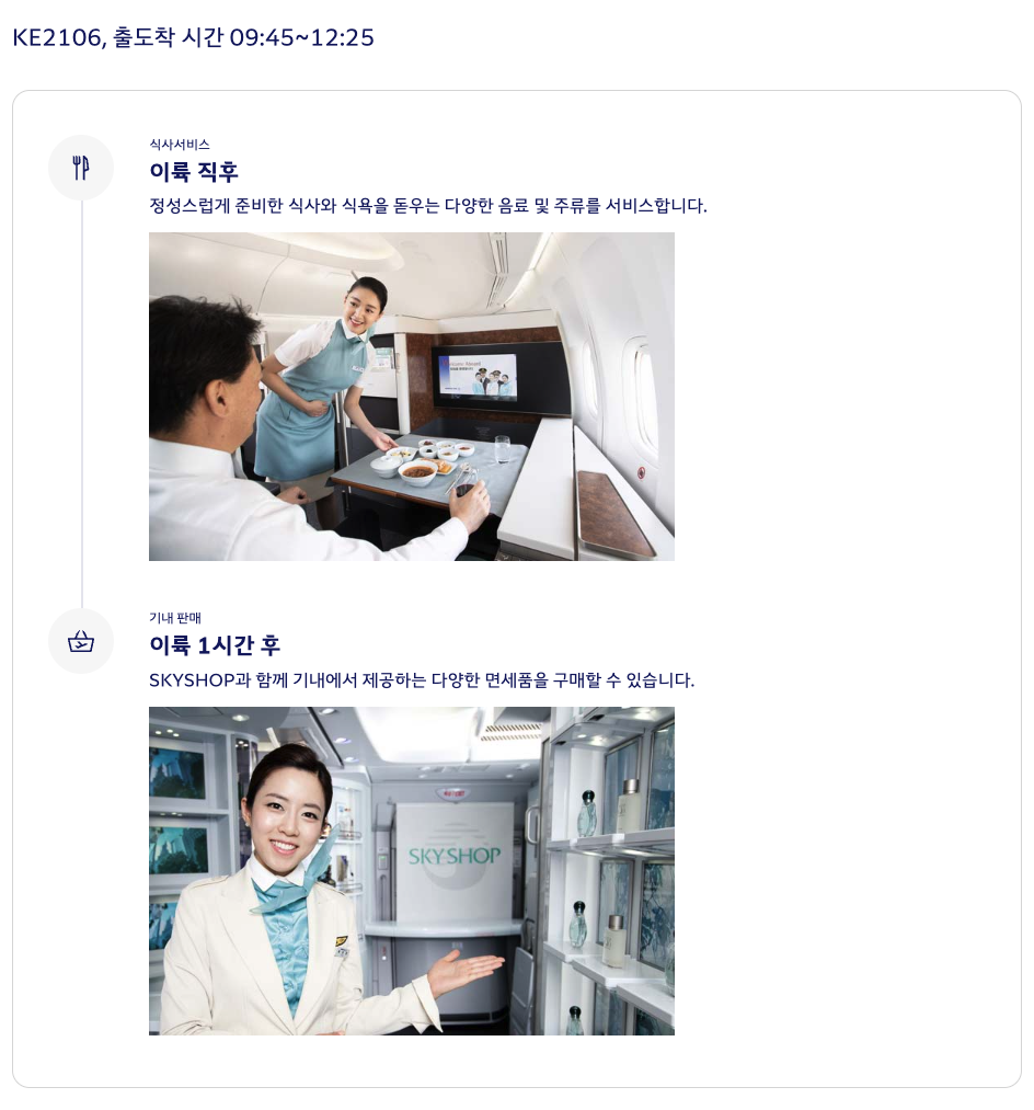 대한항공 KE2106편 기내 서비스 순서 (c) kr.koreanair.com 대한항공 KE2106편은 단거리 노선임에도 불구하고 프레스티지석에서는 비즈니스 클래스에 기대하는 모든 서비스를 제공합니다. 탑승 직후 담당 승무원분께서 정중히 인사를 건네며 식사 주문을 먼저 확인해 주셨고, 이어 웰컴 드링크와 간단한 스낵 서비스가 진행되었습니다.