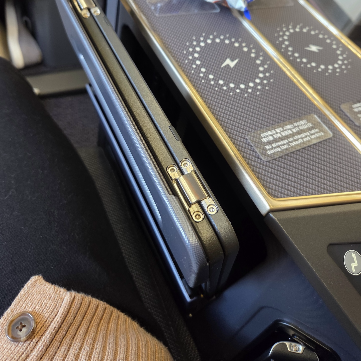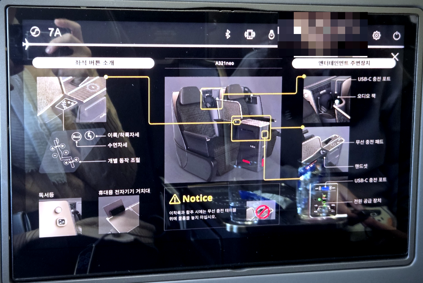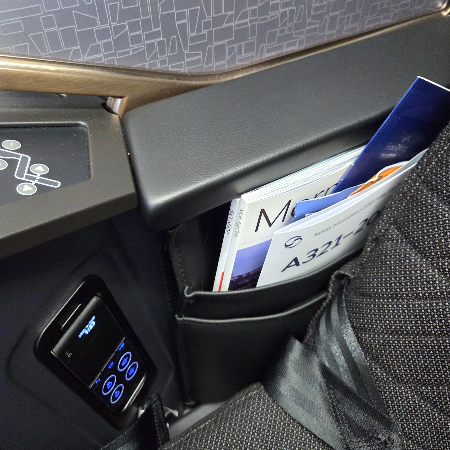 대한항공 A321neo 프레스티지 클래스 무선충전패드, 좌석 조절 버튼, 기내지 수납함 좌석 팔걸이 부분의 무선 충전 패드는 꽤 흥미로운 지점이었습니다. 이전에는 정확한 충전 위치를 찾기 어려워 효율이 떨어진다는 불만이 많았는데, 대한항공 측에서도 이를 인지했는지 패드 위아래에 두께감이 있는 투명 테이프를 붙여 위치를 표시해 두었습니다. 승객의 컴플레인을 반영해 즉각 수정하려 한 노력은 좋게 평가하지만, 설계 단계에서 패드 부분을 살짝 파이게 디자인해 이런 테이프 없이도 직관적으로 사용할 수 있게 했으면 어땠을까 하는 아쉬움도 남습니다. 충전 패드 아래로는 시트 조절 버튼이, 그 뒤쪽으로는 책자 수납함이 위치해 있습니다.