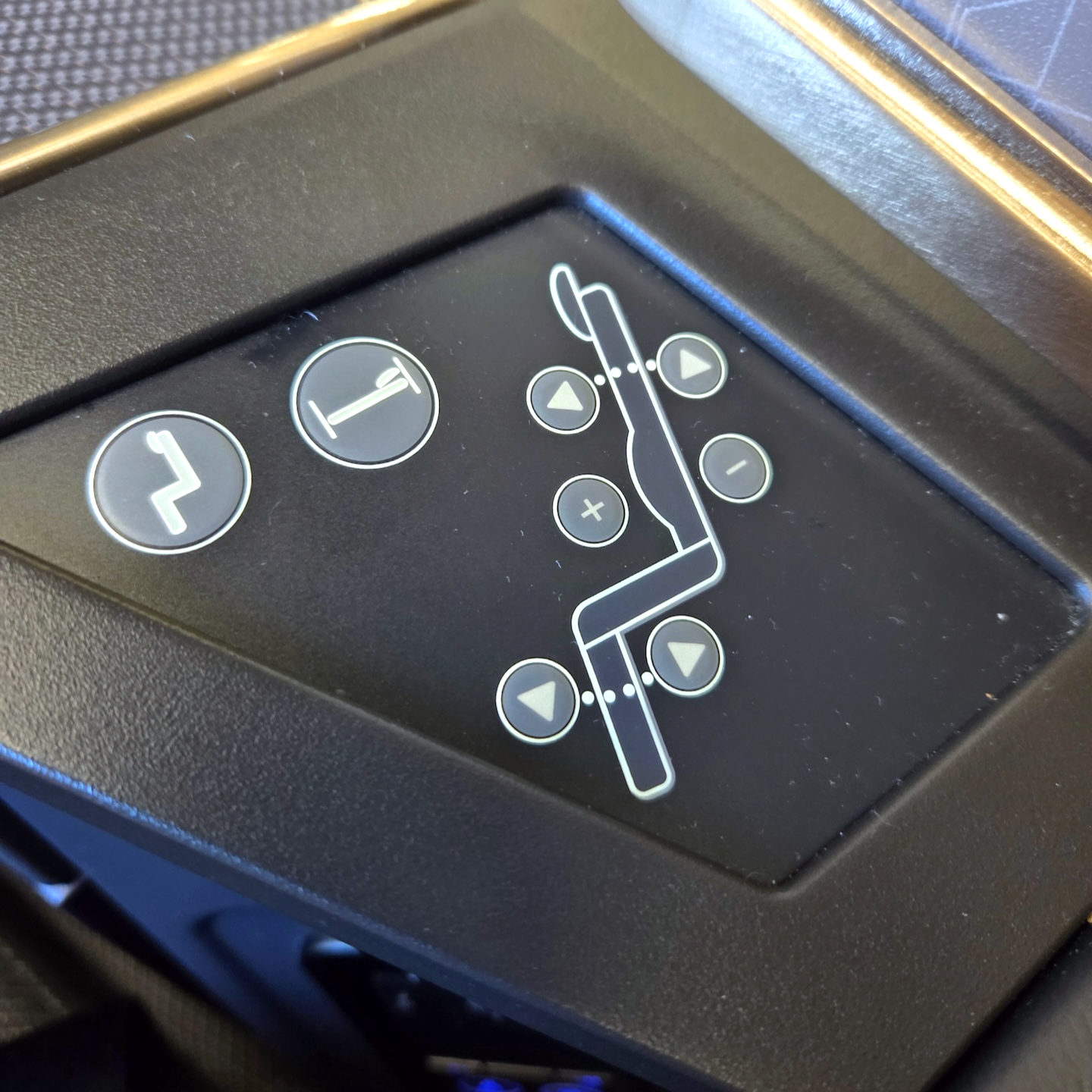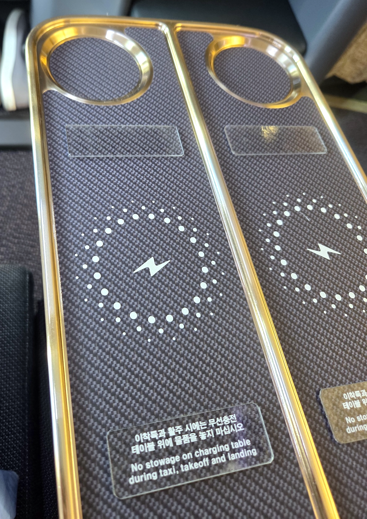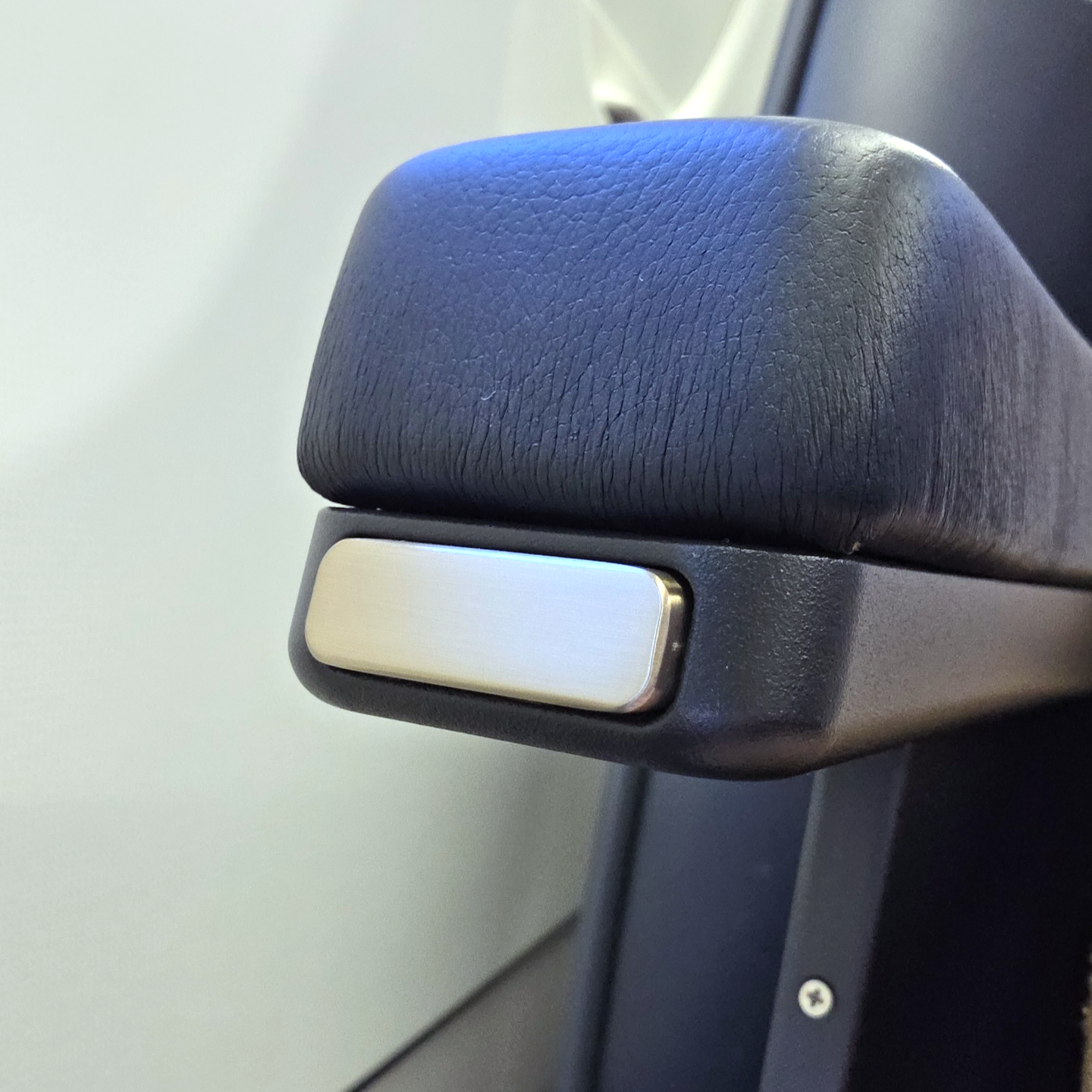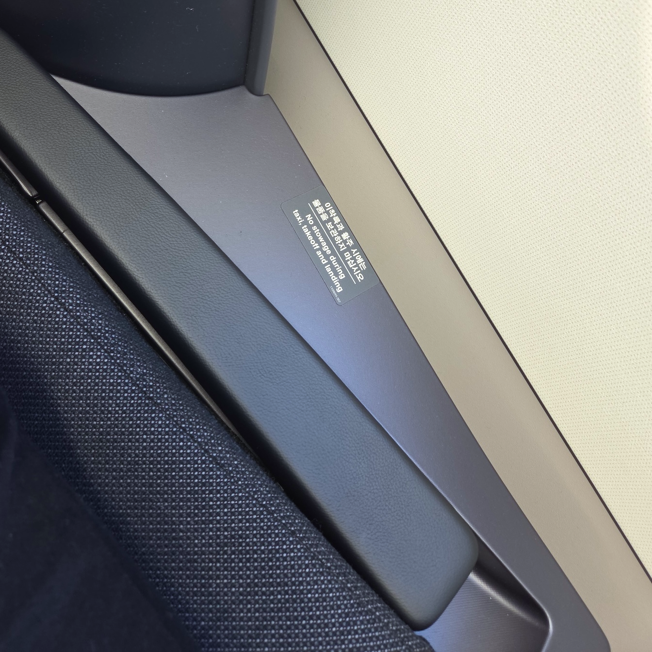 대한항공 A321neo 프레스티지 클래스 무선충전패드, 좌석 조절 버튼, 기내지 수납함 좌석 팔걸이 부분의 무선 충전 패드는 꽤 흥미로운 지점이었습니다. 이전에는 정확한 충전 위치를 찾기 어려워 효율이 떨어진다는 불만이 많았는데, 대한항공 측에서도 이를 인지했는지 패드 위아래에 두께감이 있는 투명 테이프를 붙여 위치를 표시해 두었습니다. 승객의 컴플레인을 반영해 즉각 수정하려 한 노력은 좋게 평가하지만, 설계 단계에서 패드 부분을 살짝 파이게 디자인해 이런 테이프 없이도 직관적으로 사용할 수 있게 했으면 어땠을까 하는 아쉬움도 남습니다. 충전 패드 아래로는 시트 조절 버튼이, 그 뒤쪽으로는 책자 수납함이 위치해 있습니다.